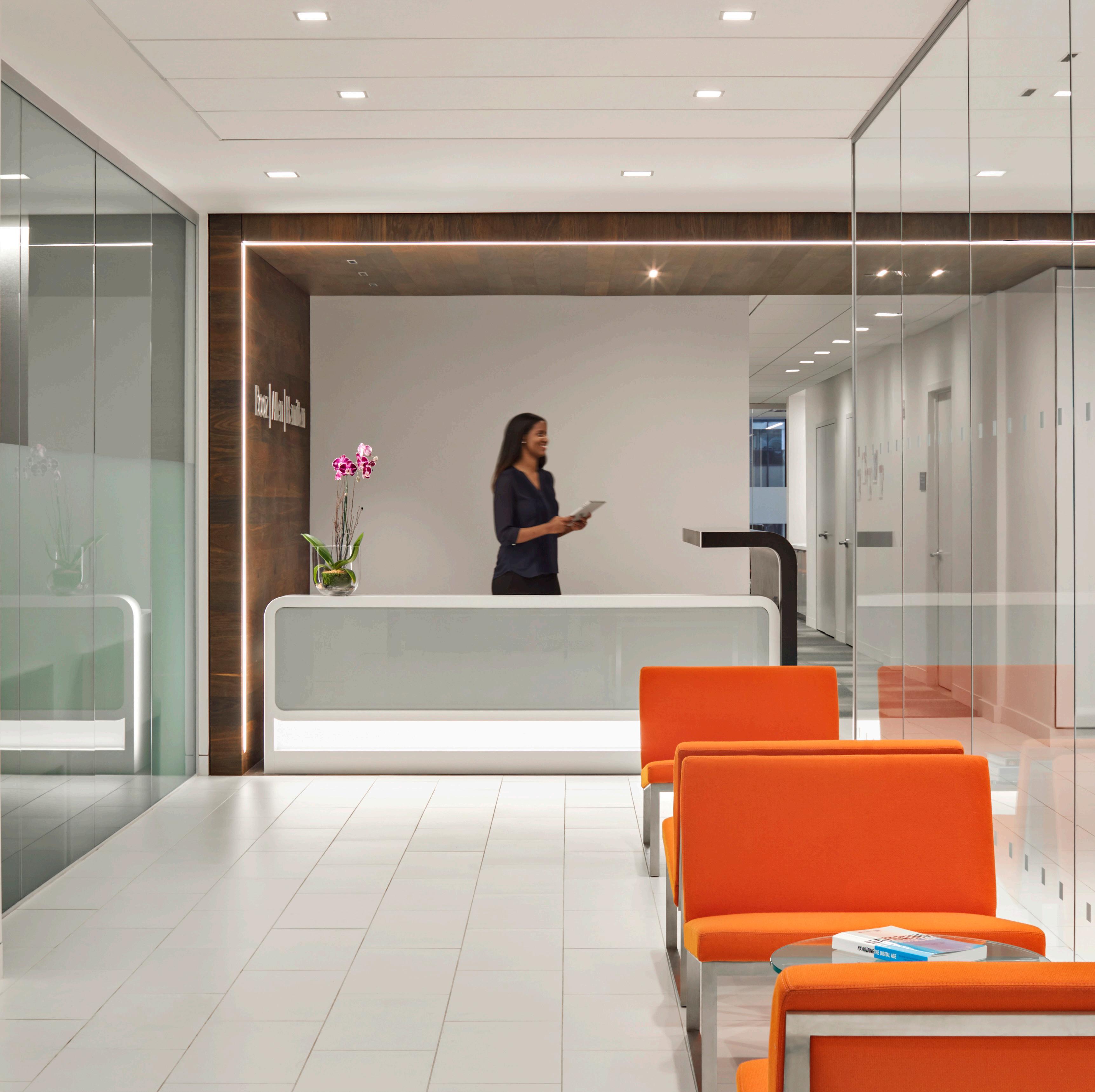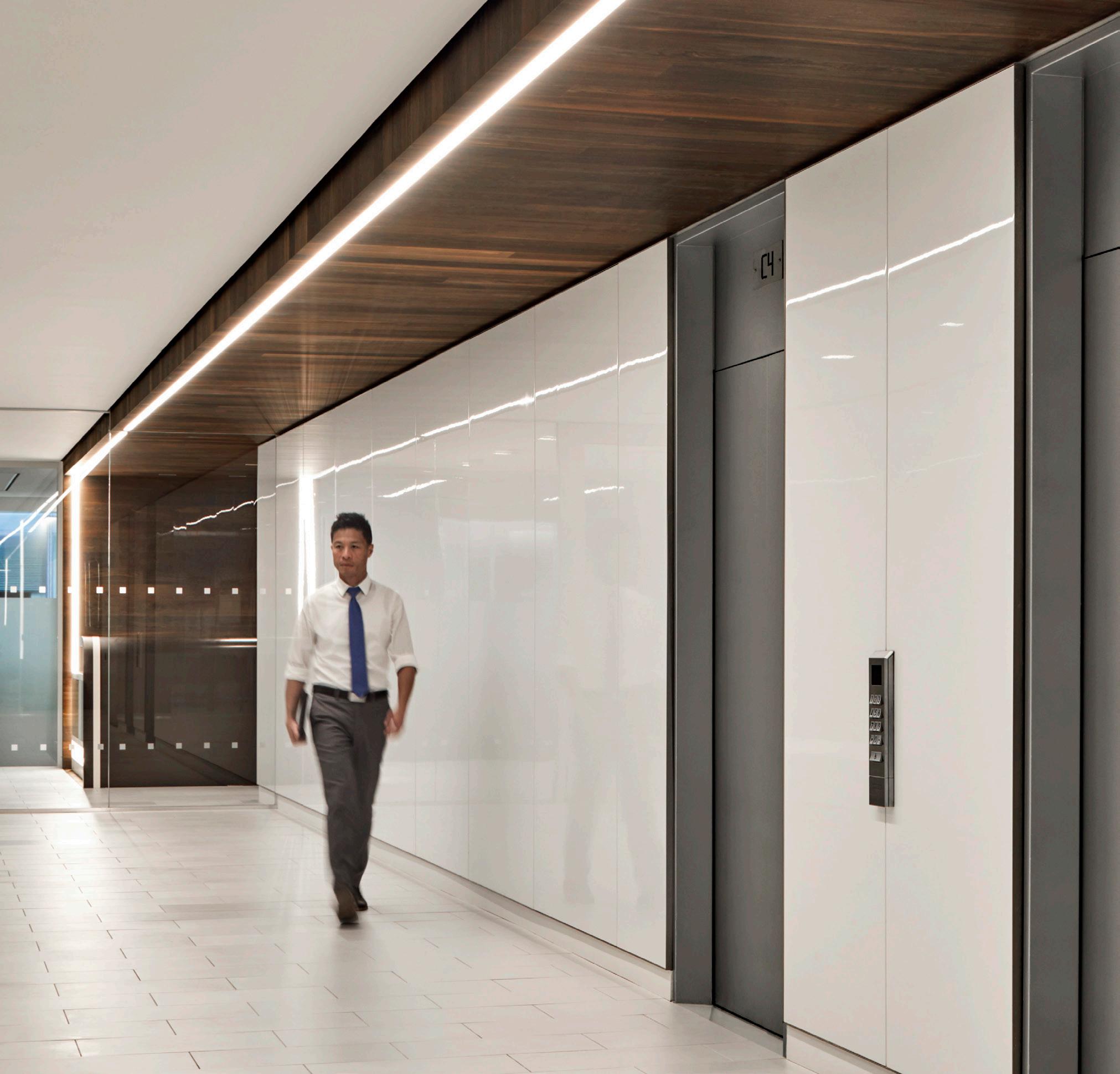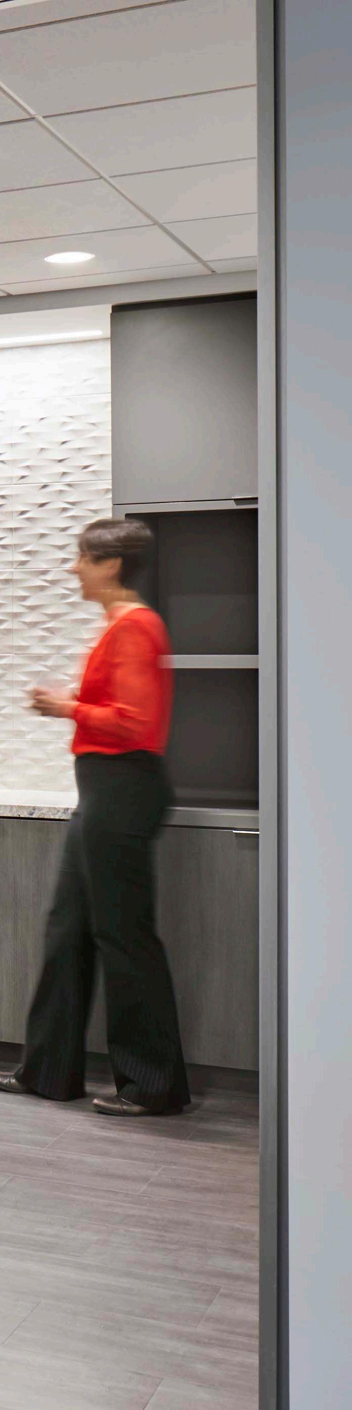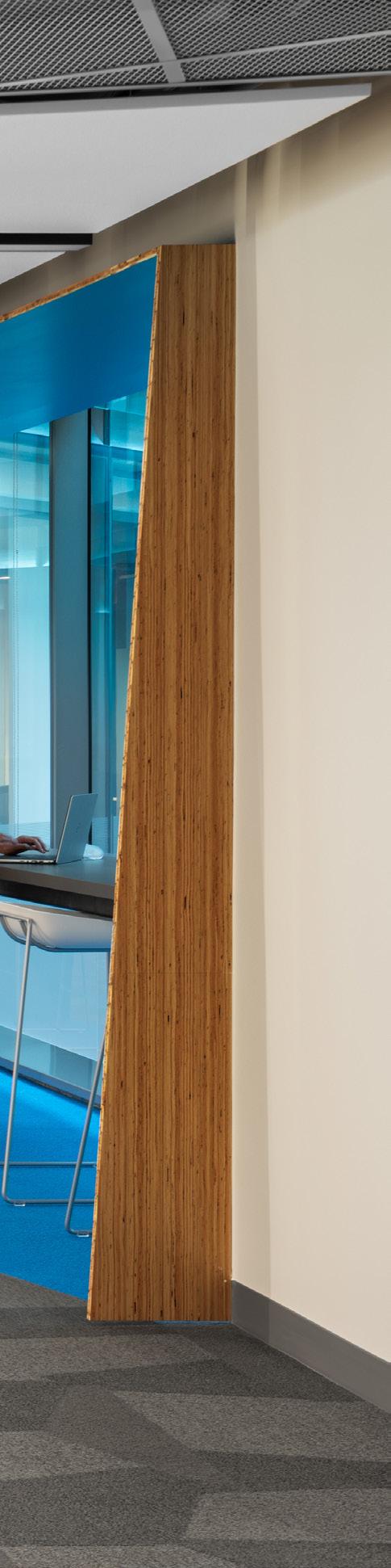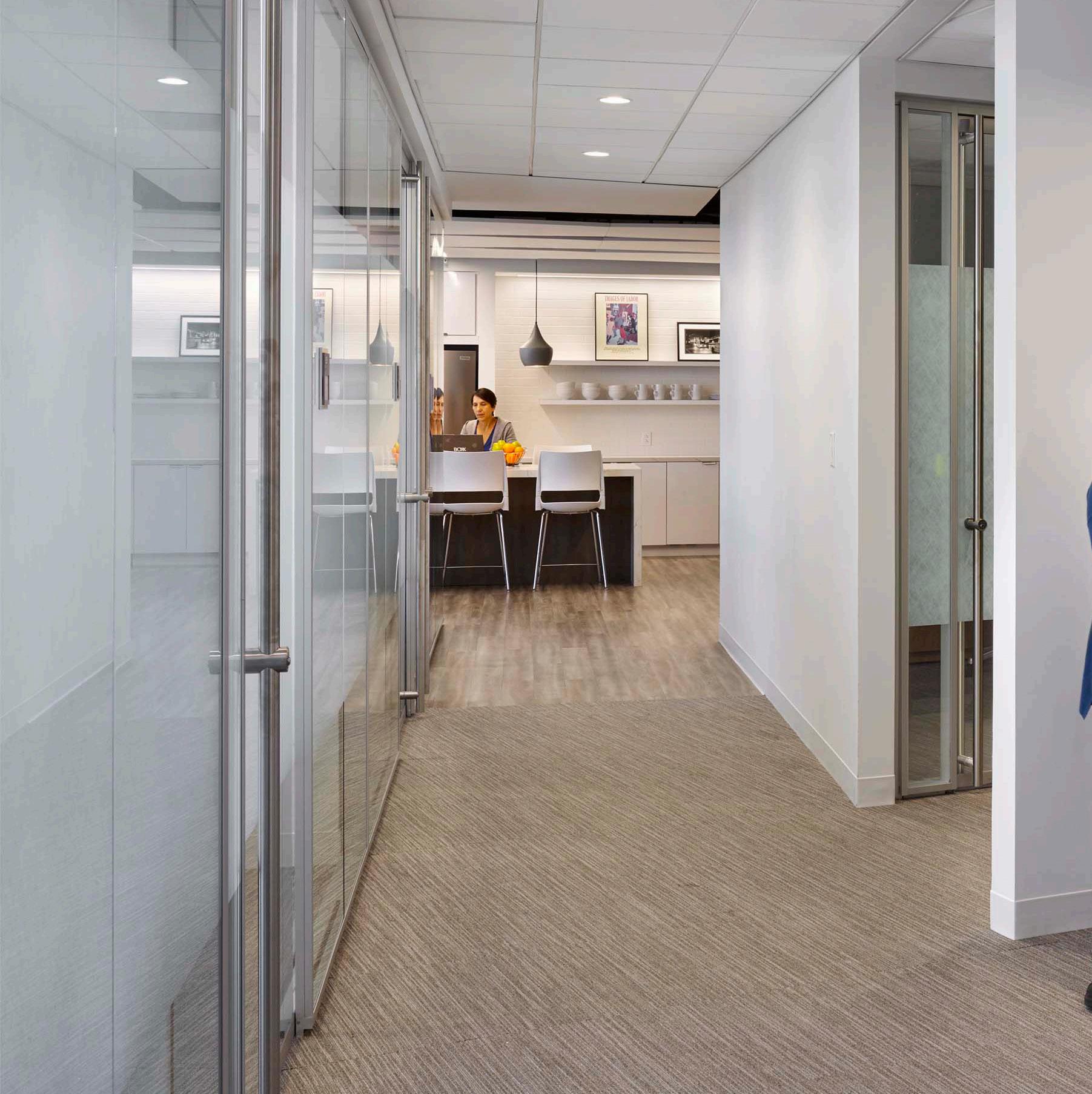 The transformation of their brand is further manifested in the architecture with a wood wrapping motif. The element that carries throughout the elevator lobby and main “HUB” and collaboration areas is symbolic of the progression and momentum the company has attained over the past century. Taking a traditionally old material, wood, and contrasting it with new-age materials creates a look and feel representative of the client’s ideologies. Collaborative areas integrated with traditional workplace paradigm, along with a play of old and new materials, define the character of the office space: an ode to the past and an advancement toward the future.