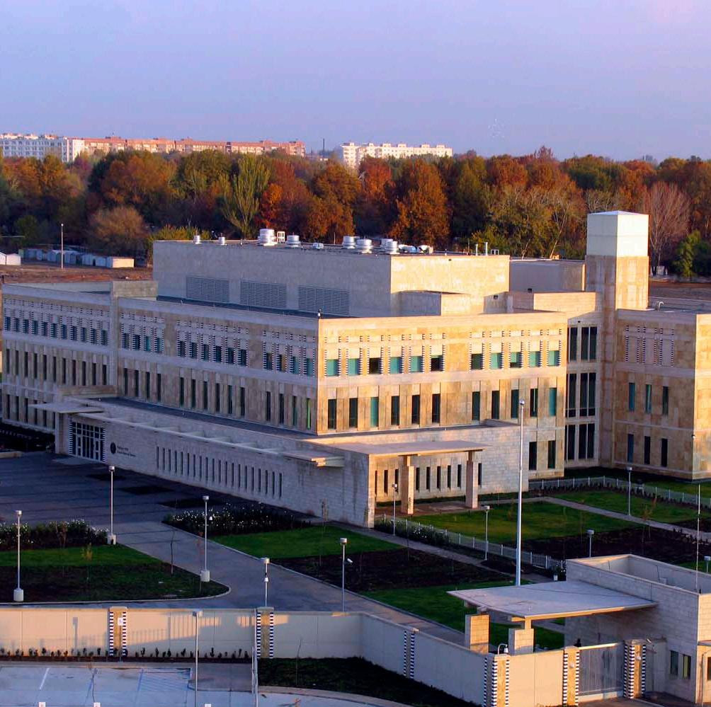 The challenge was to establish a design that would meet the Department of State’s newly established standards while presenting a unique and attractive appearance that is indicative of the location, yet reflective of the United States. The buildings appear as a series of rectangles with an exterior skin of limestone imported from nearby Kazakhstan. Decorative interior elements including local colored tile further emphasize the importance of the locality.