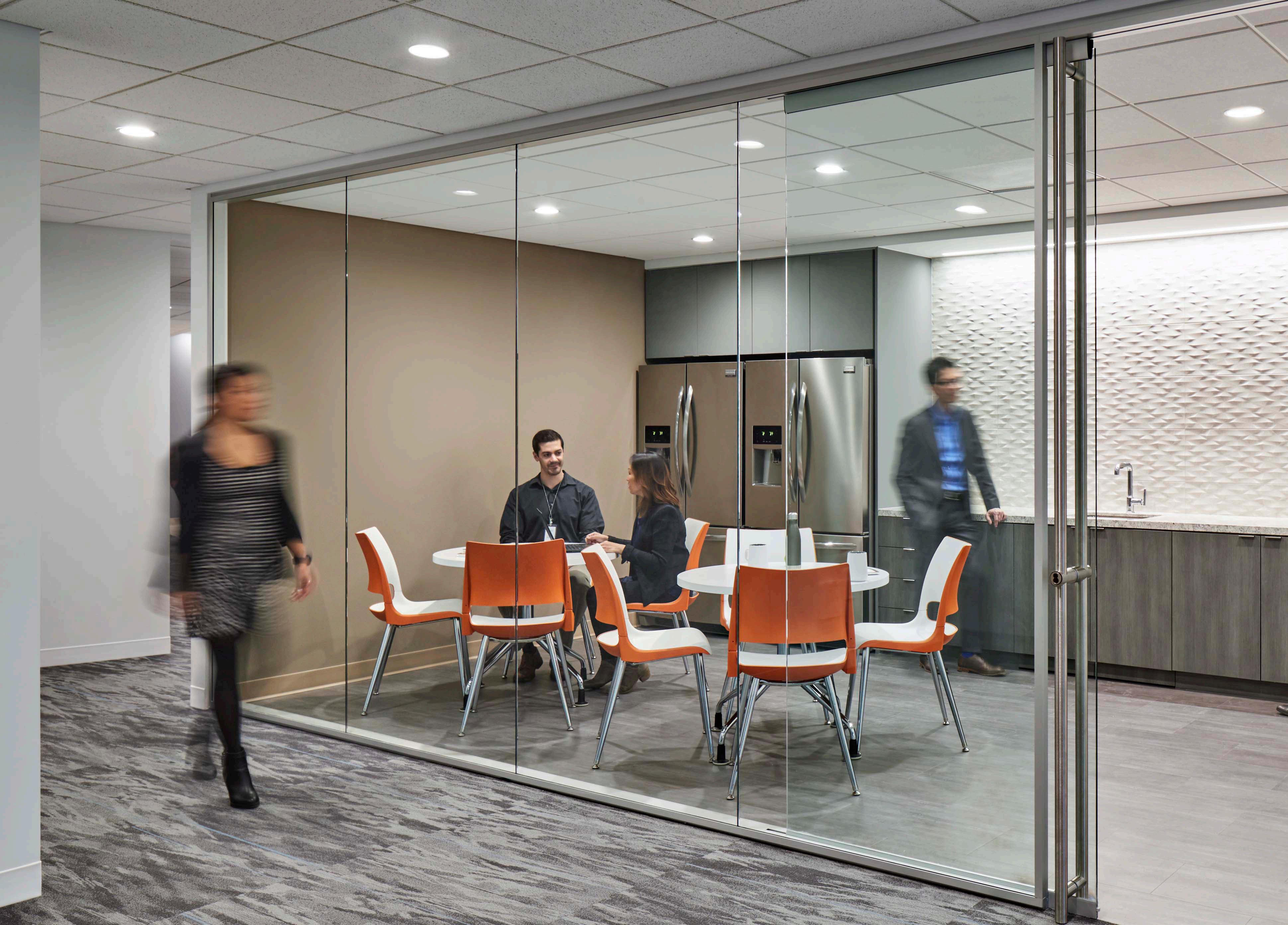 The project started out as a renovation of an existing build out. HOK partnered with and won the trust of this client by understanding that a “surgical” rather than a clean sweep approach to design was required. The team analyzed where and how to achieve the greatest impact for the budget. Understanding BAE’s desire for transparency, HOK was able to achieve this goal and satisfy the local building code requirements for fire separation.