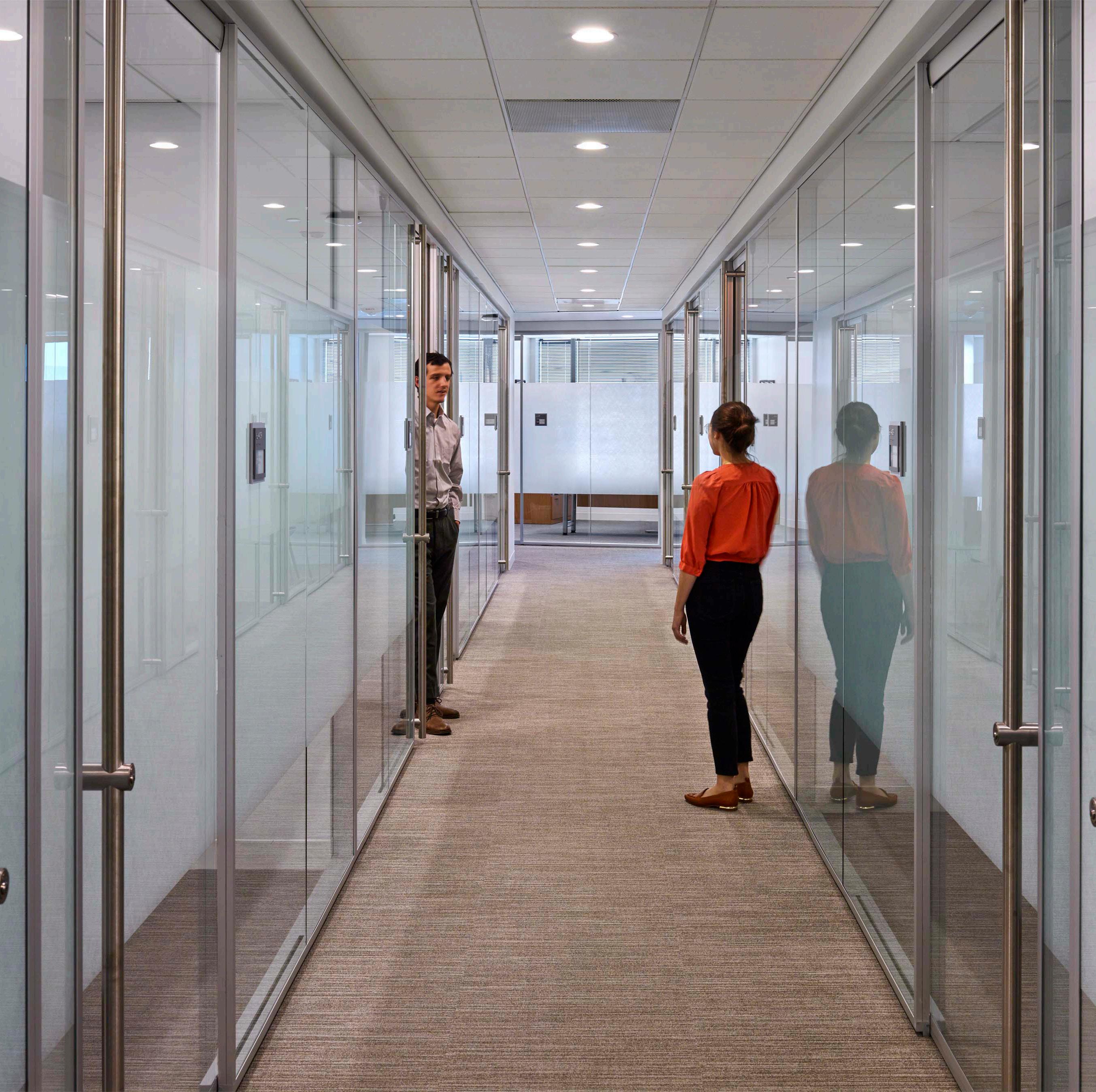 Spread over seven floors, six of which are connected by glass enclosed interconnecting stairs, HOK worked extensively with the Building Department for the City of Fairfax, VA to design the proper enclosure solution that achieved both BAE desires for openness as well as the City’s requirements for fire separation.