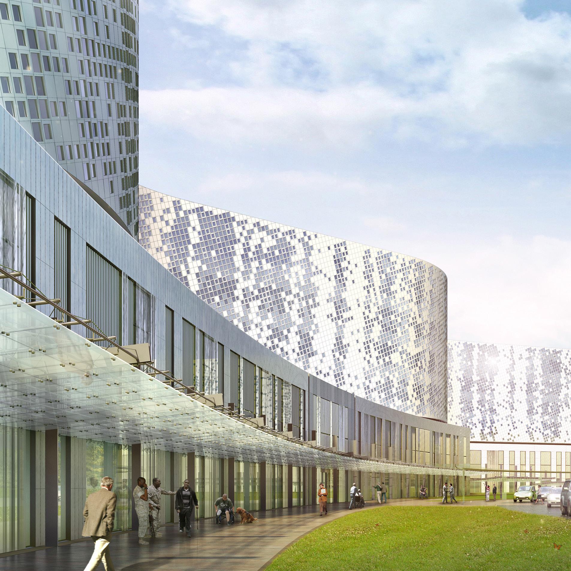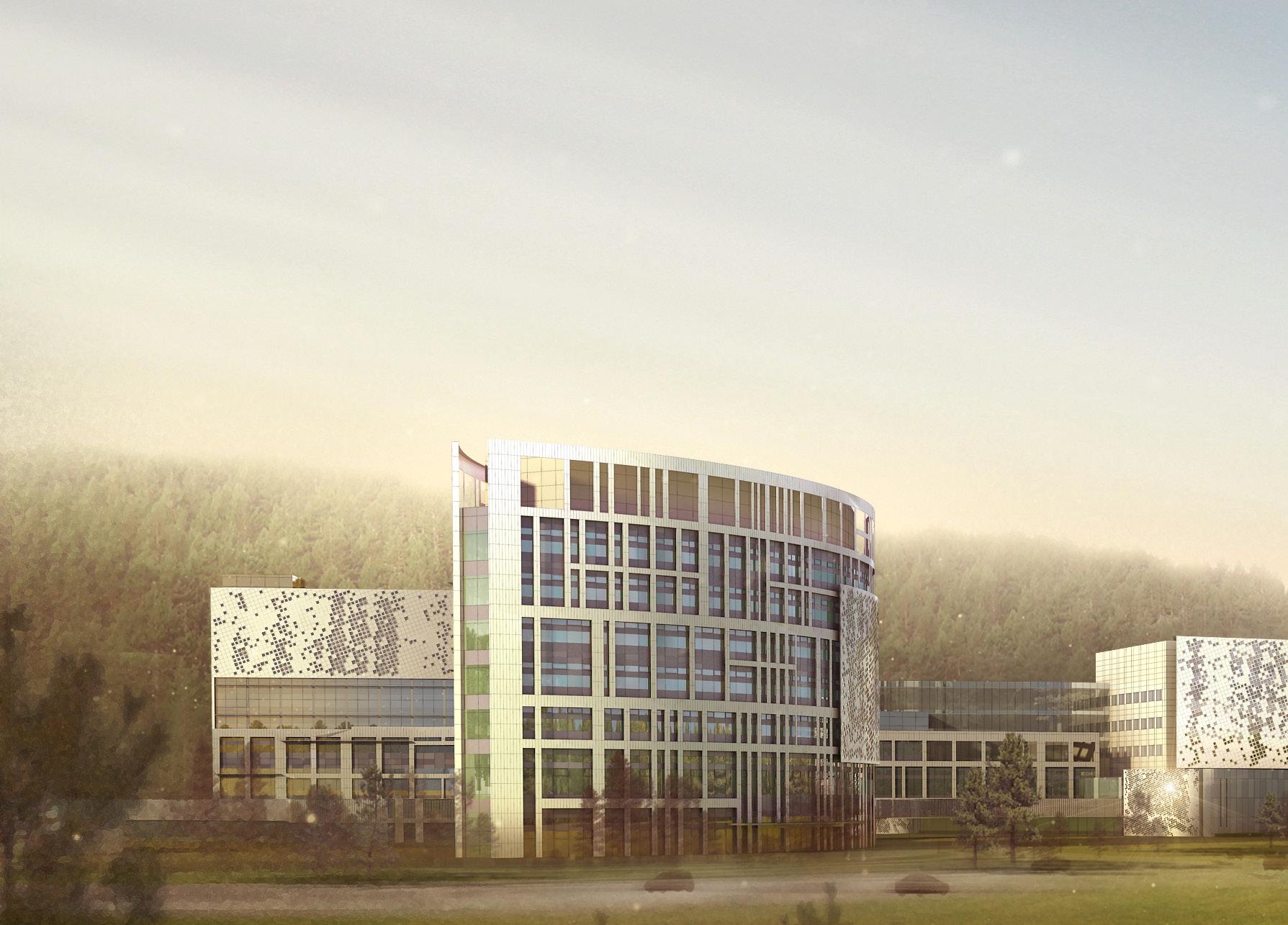 The strong, simple geometry of the main building addresses both the compound and the area beyond. The large-scale grid expression of the main façade is visible from the nearby highway. The skin is yellow-beige stone and silver-grey metals which is modern and forward looking, while still recalling the traditional urban architecture of the old city of Zagreb. The penthouse of the building glows at night, reflecting the theme of vertical punctuations common to the Zagreb skyline.