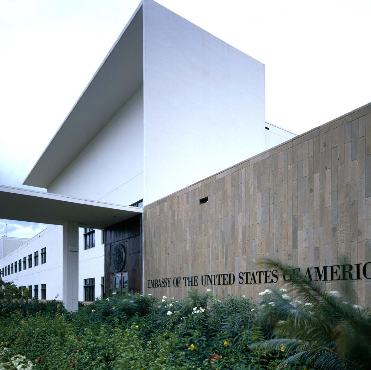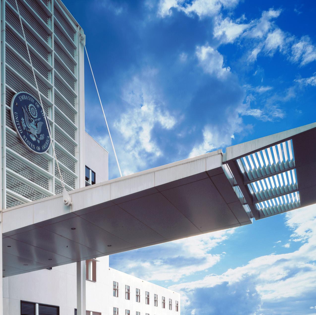 In order to enhance visitor experience while in the main new office building, a system of plazas was used. A shade canopy perched atop an angled wall offers protection to consular visitors while a tree lined entry drive and sun shaded path between buildings creates a warm, sheltered environment. With a one-story volume pulled out from under the building, the Consular Section creates an expression of having its own identity. This section is separated from the rest of the campus with enclosed walls and fences. The common space consists of several small groups of areas connected to a light-filled high ceiling space, providing both separate working areas as well as one common area. The efficiency of this design allows for all building personnel to be accommodated on two floors. Light shelves occurring at the windows provide sun shade while promoting day light in the interior spaces while the use of vertical punched windows at the clerestory level of the central high ceiling interior space and representational spaces allows more natural light into the building.