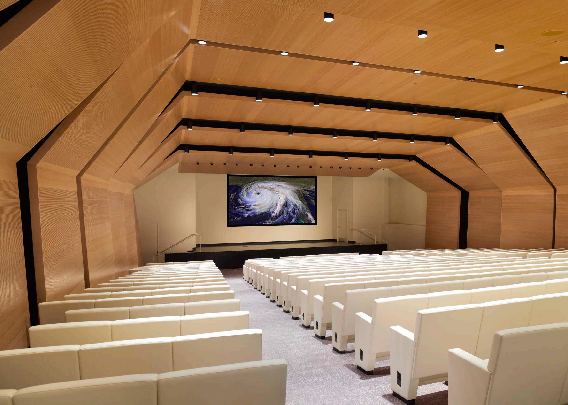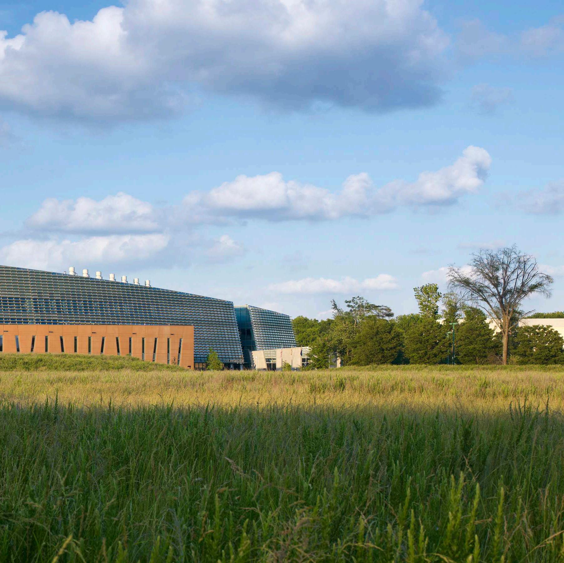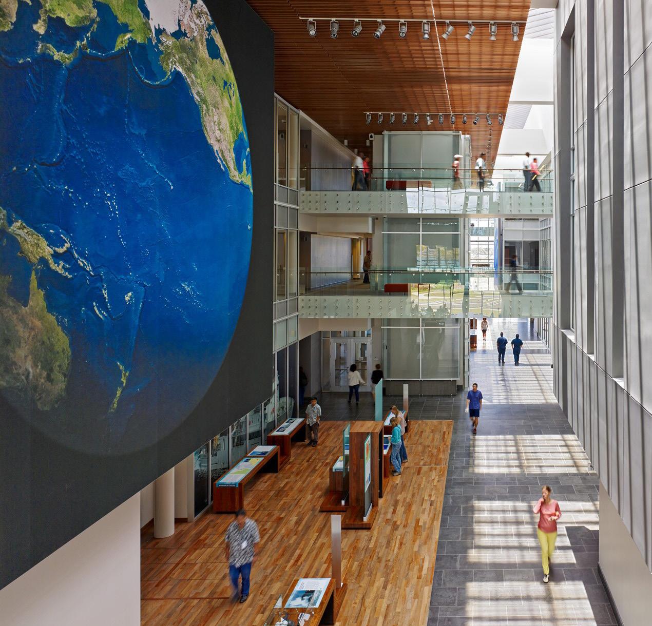 Just as natural systems do not operate in straight lines, the building is configured in a series of curving wings that intersect in a central atrium. The building form is organic, with “waves” of space. The north elevation features continuous horizontal bands of windows that allow sweeping views into the woodland preserve. The south elevation consists of a curtain wall with sunscreens that reduce solar heat gain and act as light shelves that bounce daylight deep into interior spaces. Visible from the interior, the lower roof surfaces are vegetative planes. These surfaces surround the sweeping, inclined central roof that rises from the building entry to an apex at the cupola. Here, within the facility’s highest occupied space, researchers collect atmospheric data.