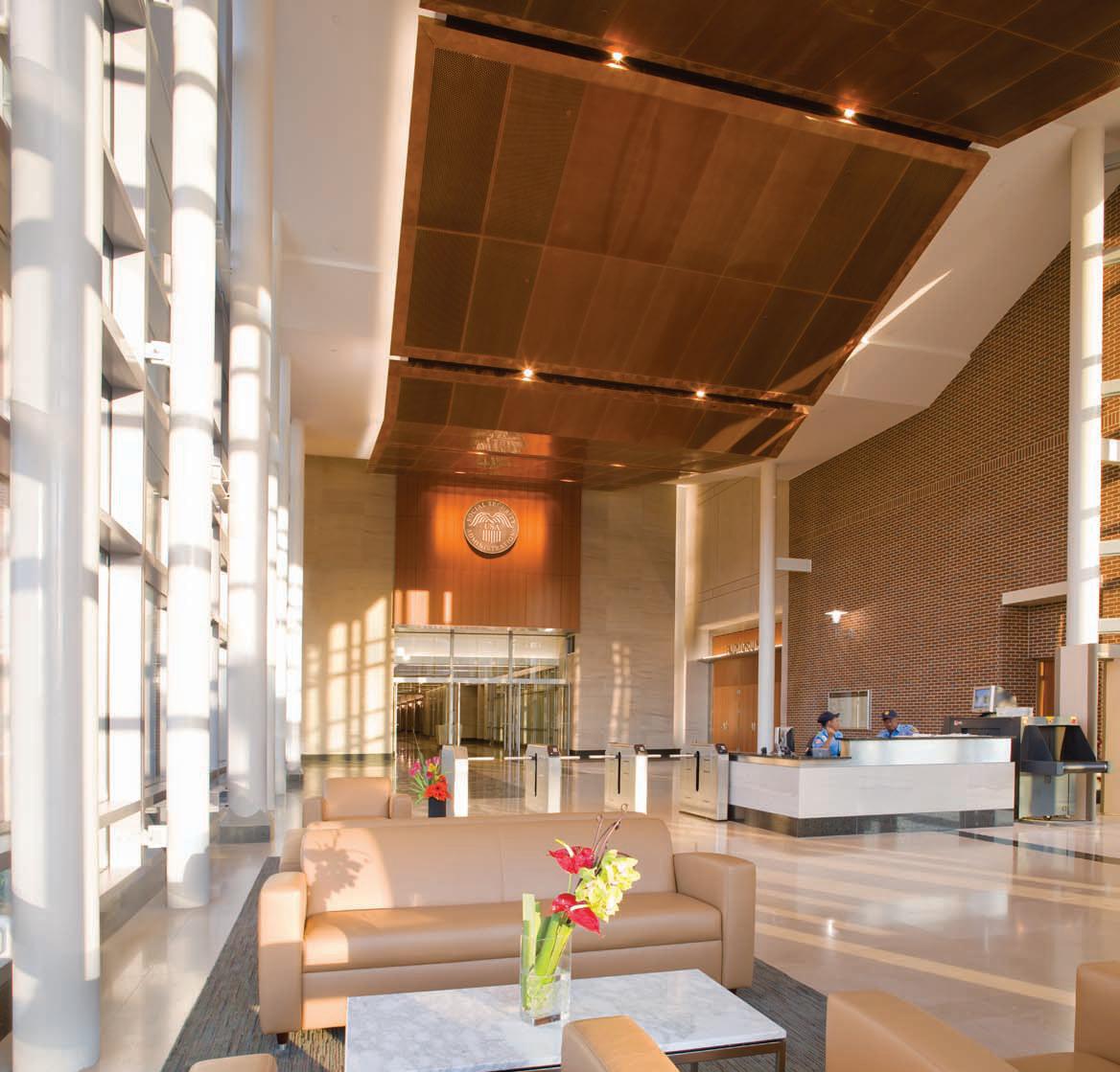 Several “green” elements were incorporated in HOK’s design. Light shelves have been installed to increase the building’s daylighting potential and reduce energy costs. Special materials, such as low VOC paint and carpet made from recyclable content, add to the building’s environmental sensitivity. The majority of building materials, including local stone, reinforced steel, asphalt-paving materials, sand and blocks, are gathered from local sources. The use of local building materials conserves both resources and finances by reducing transportation requirements.