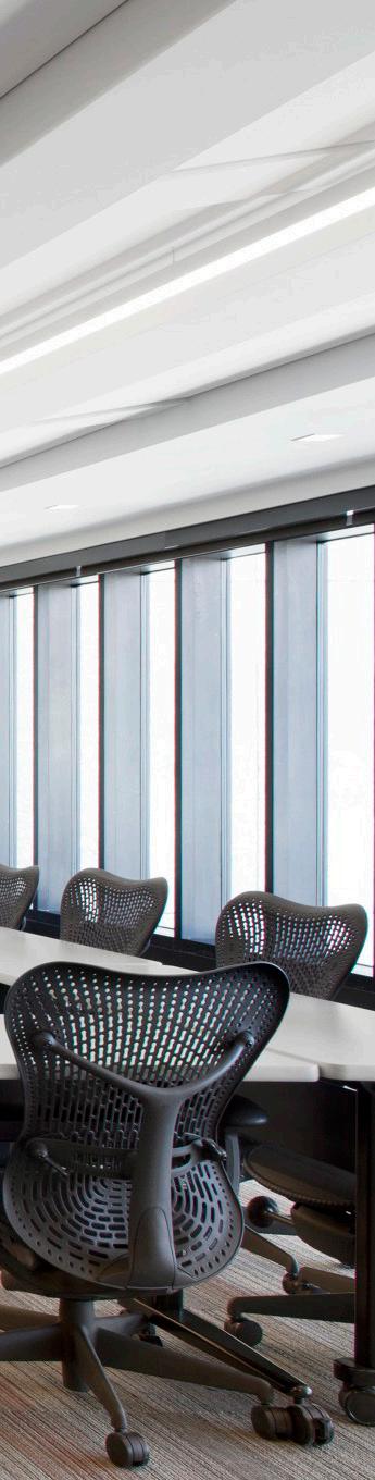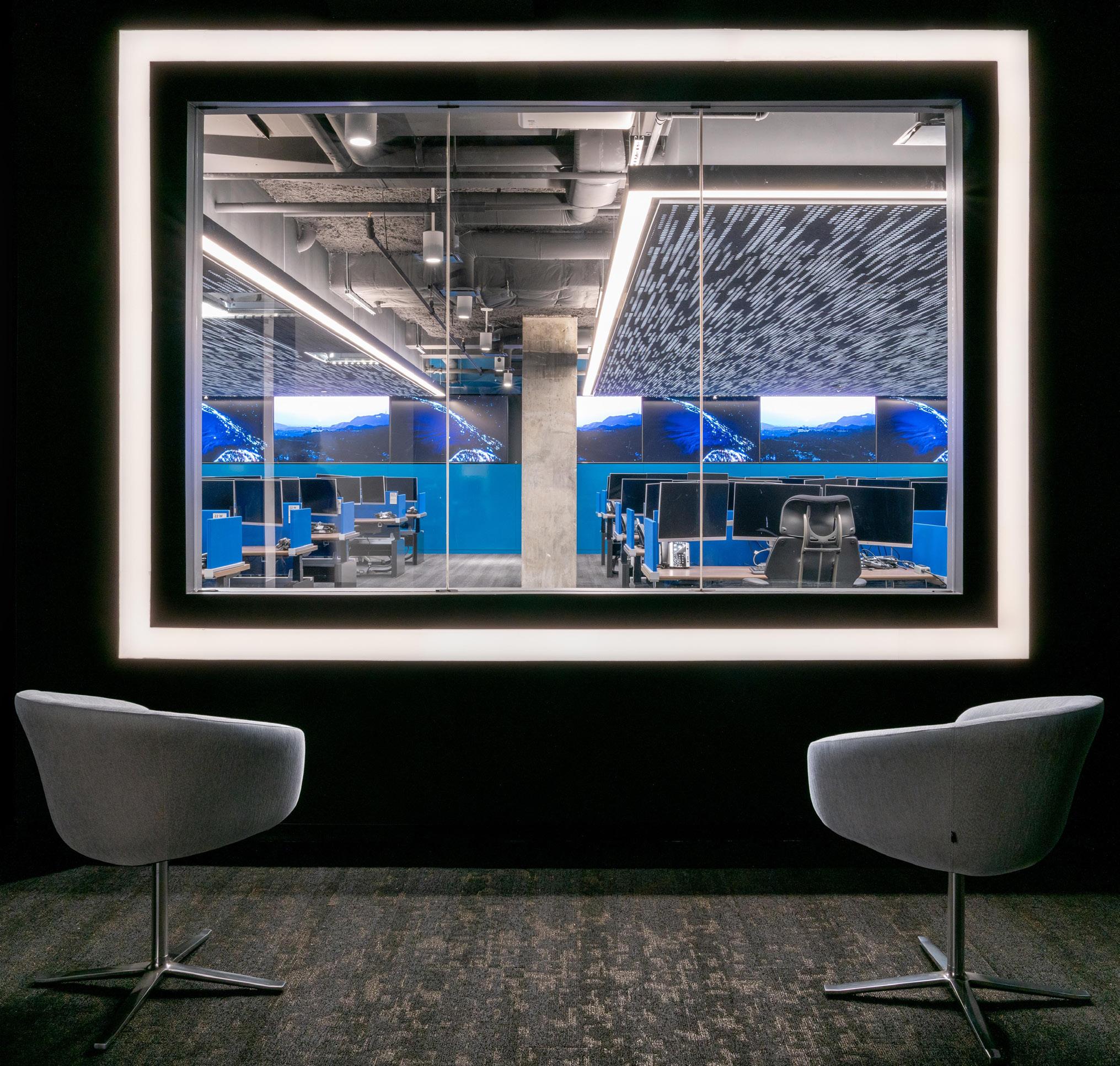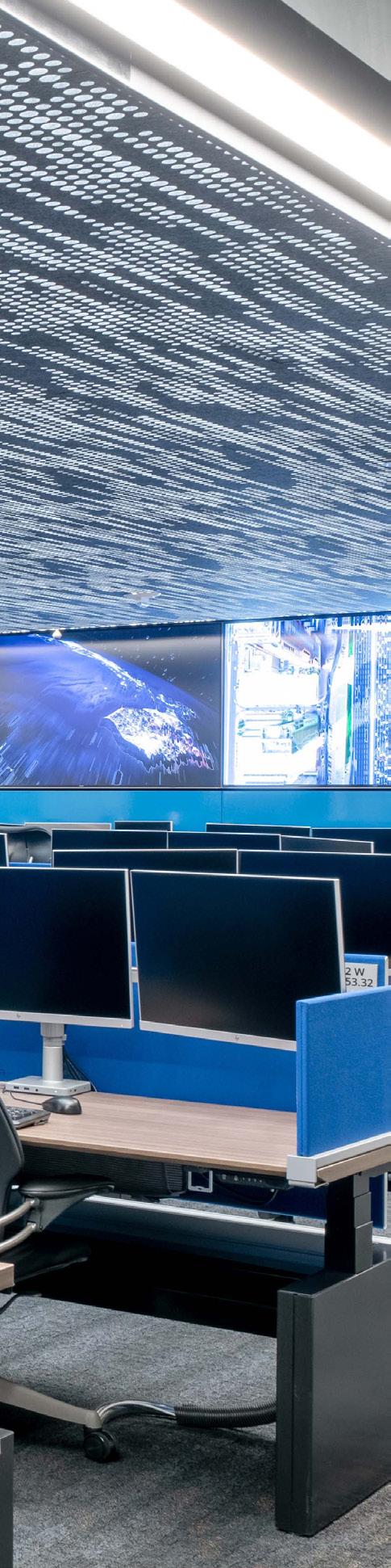Color is used to define areas within the open spaces and special consideration is given to acoustics with the selection of sound absorbing materials. High-performance fabrics evoke the handmade but utilize high-tech materials, and interactive media walls and switch glass vision screens are placed throughout. Spaces include a 24/7-operational observation center called The Watch Floor, the Cyber Internet of Things (loT) Studio—a futuristic setting for teams to develop and test new technology, and a client collaboration area called The Core. Flexible workstations, lounge areas, and a café offer employees agile solutions for working, and allow research teams to reconfigure the spaces quickly in response to new demands and research directions. The highly flexible design propels breakthroughs in cyber security and is a catalyst for disruptive, interactive technology-enabled solutions.