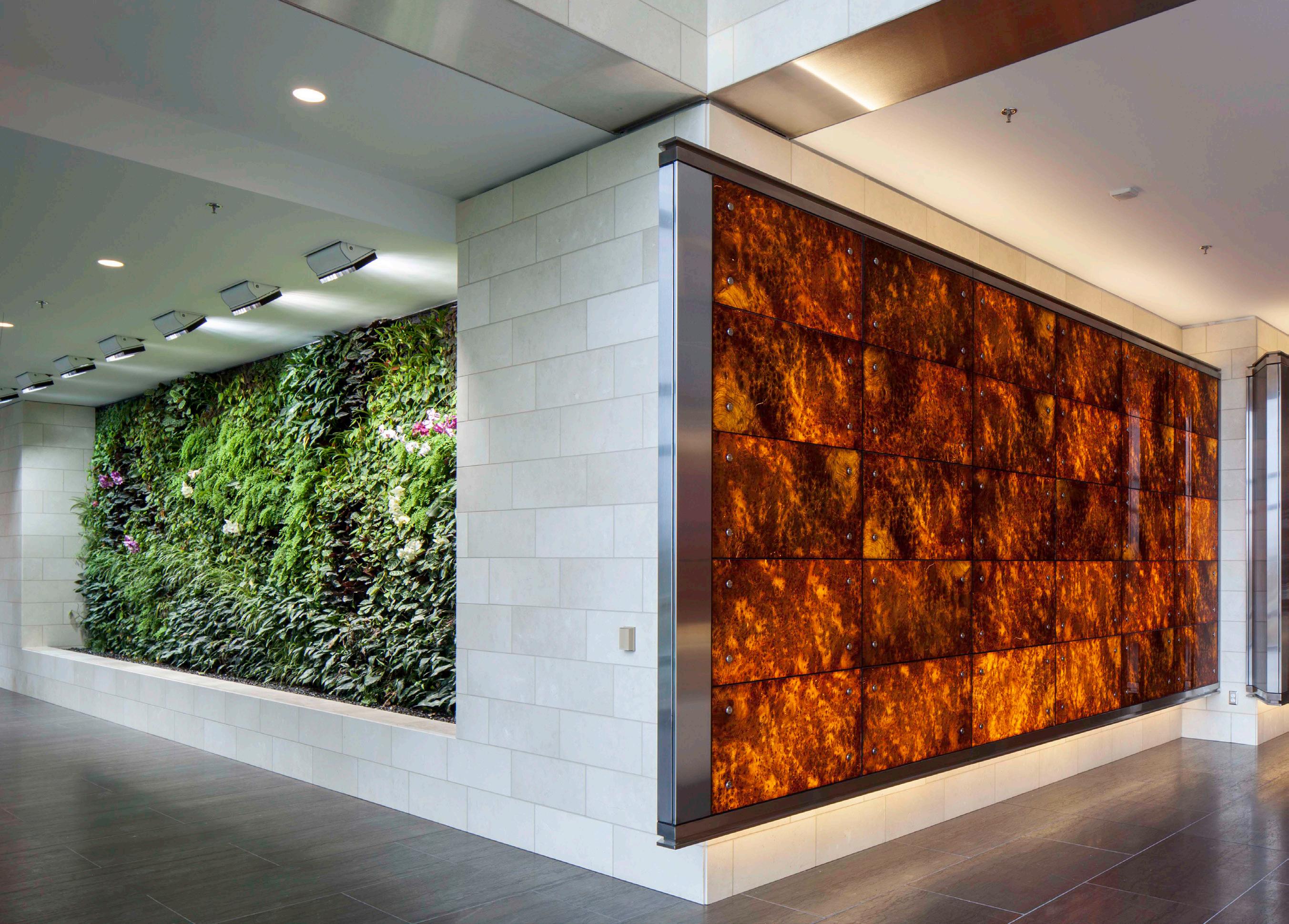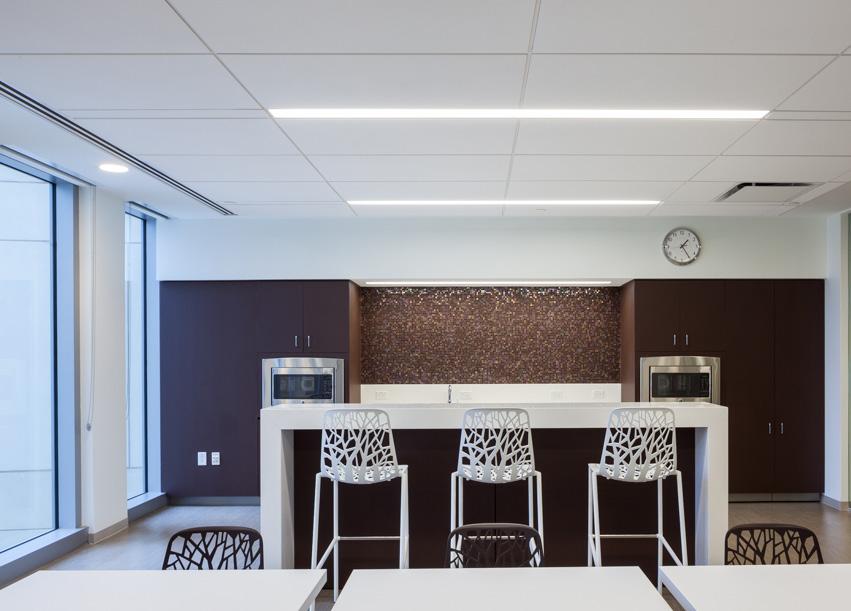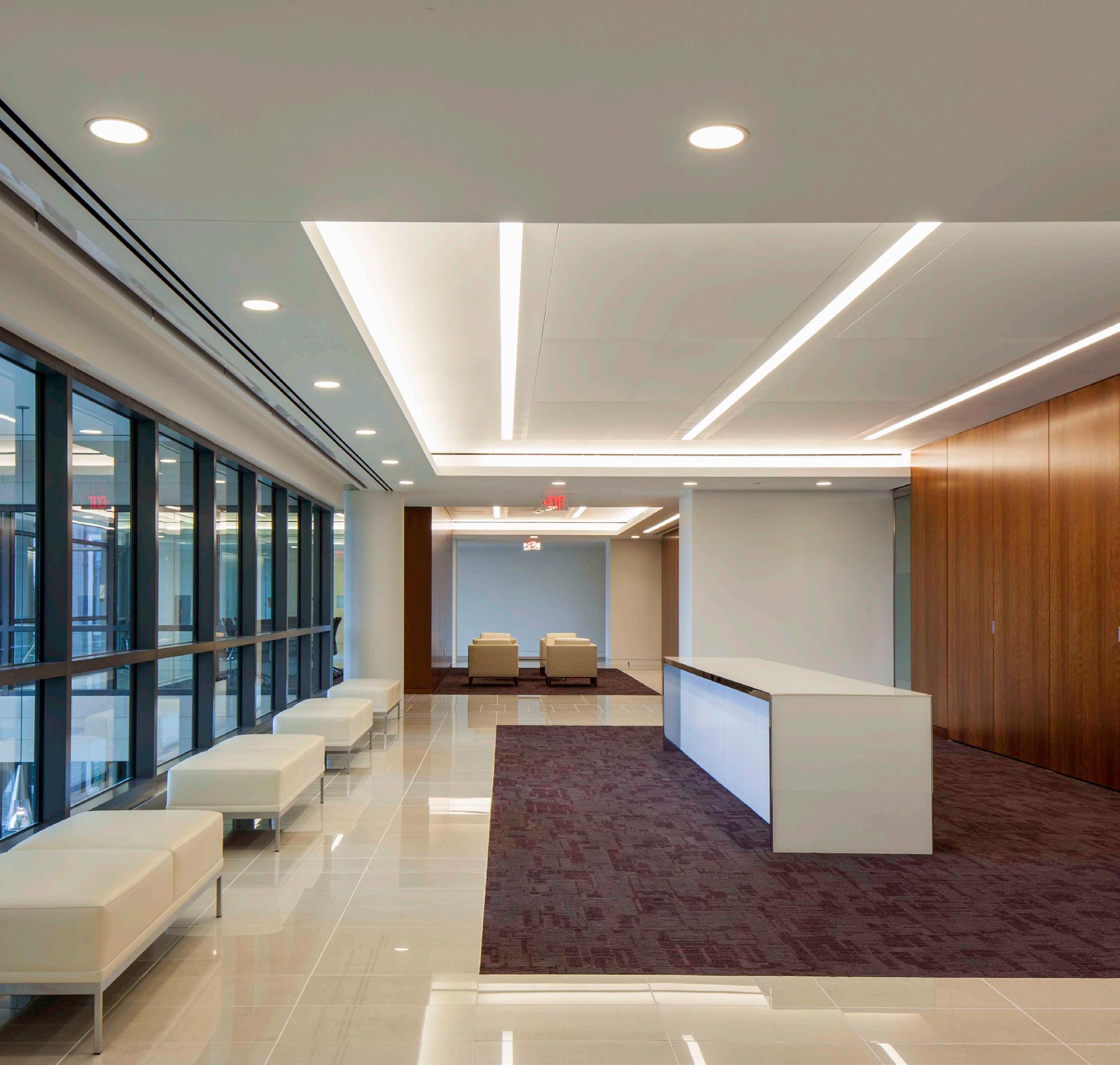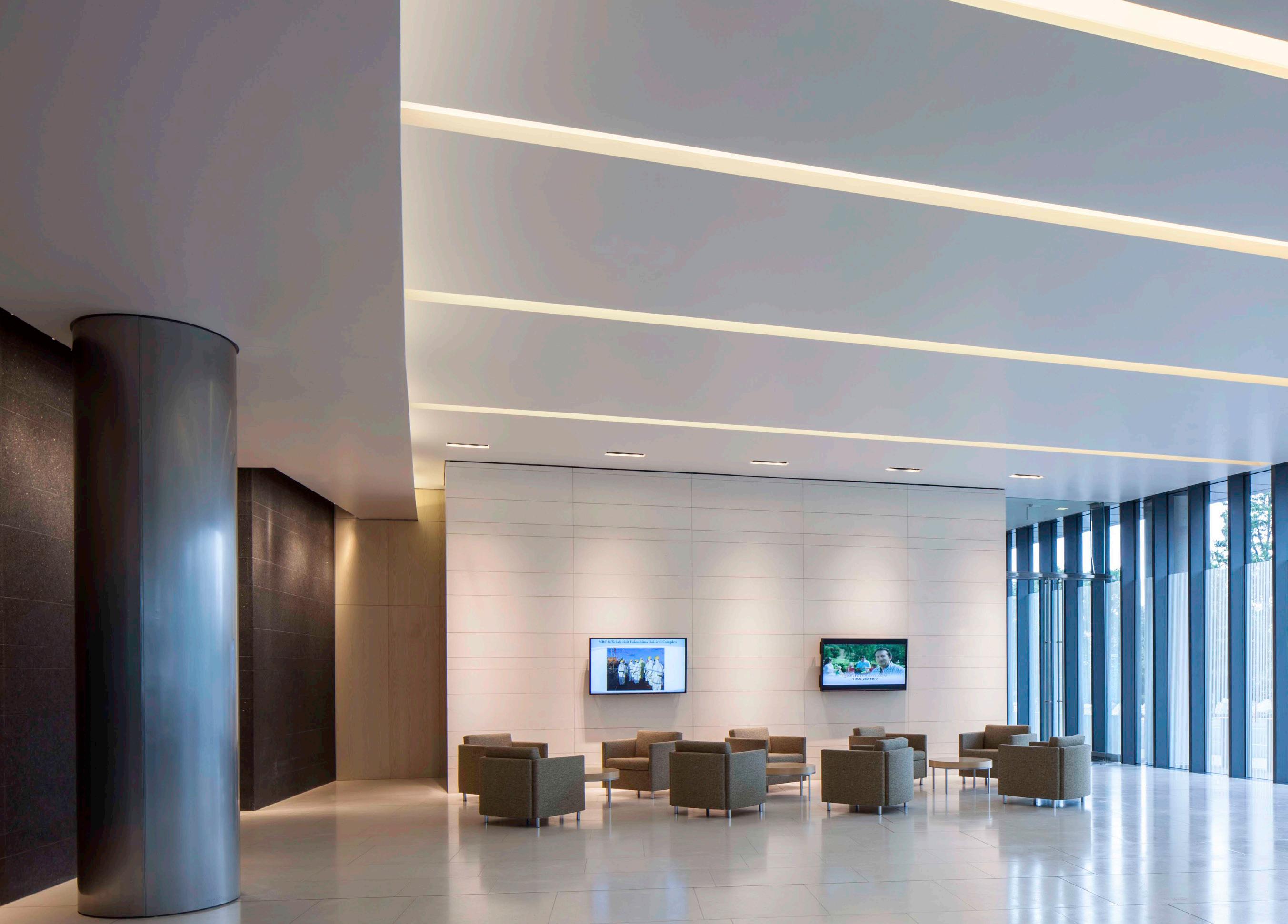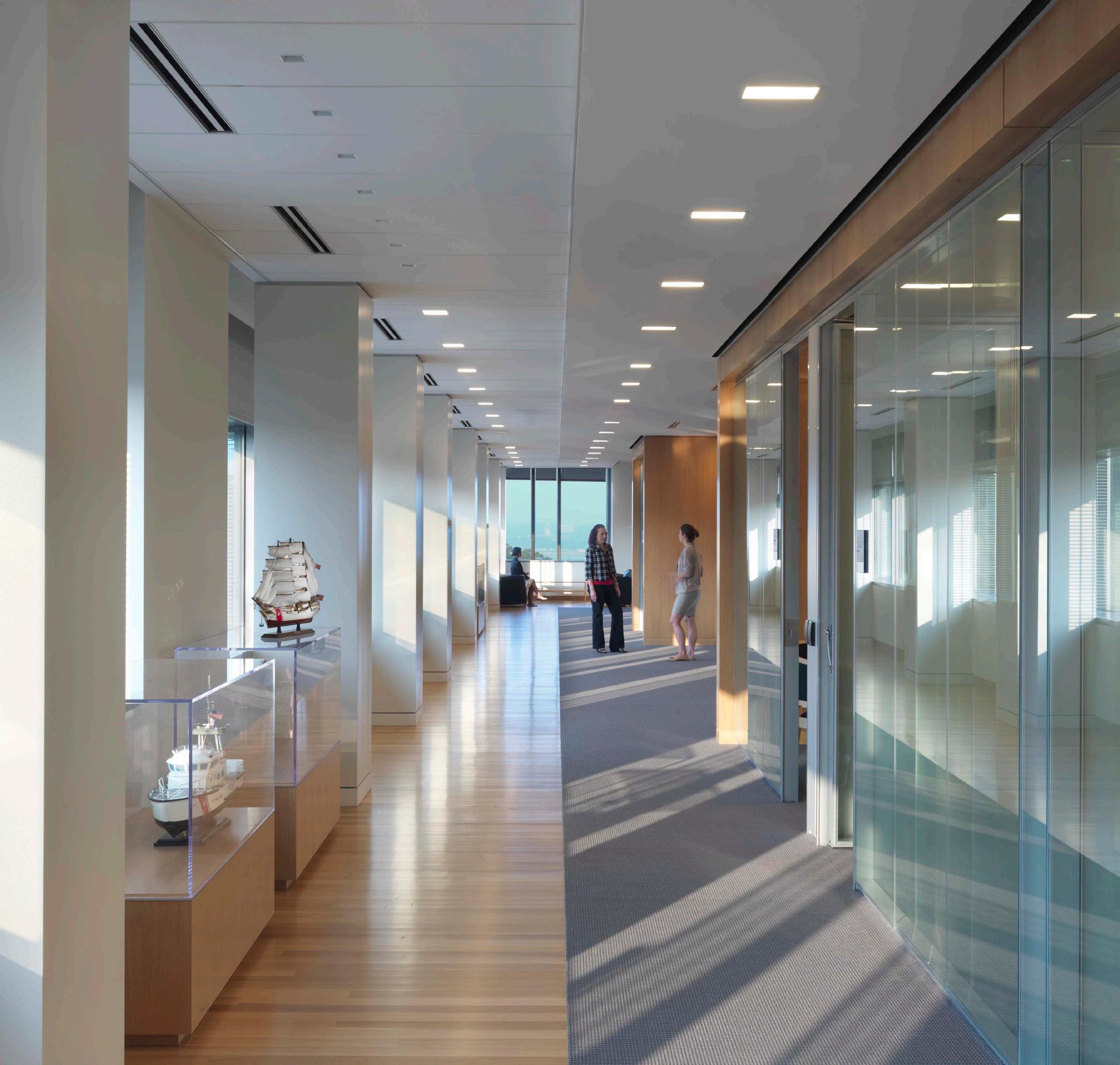 Interior spaces include open and private office areas, a main lobby and senior executive suite, a conference center, a childcare facility, a medical clinic, a law library and two commercial-grade kitchens. Together with the zinc panels on the exterior, hardwood wall panels and floors contribute to a nautical aesthetic.