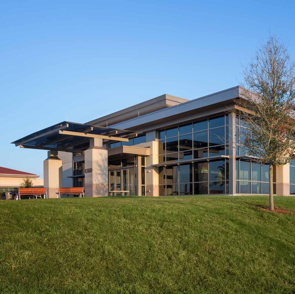Glazing on the north and south sides of the building maximizes daylight and views. Sustainable design strategies helped reduce the center’s projected energy use by 30 percent compared to code requirements.