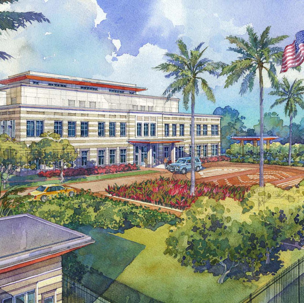 The U.S. Department of State chose the Design/Build team of HOK and Telesource, Inc for a 54,400 sq. ft. New Embassy Compound (NEC) in Suva, Fiji. The overall design theme of the NEC was primarily influenced by Fijian art and culture, which are very rich in the visual arts.