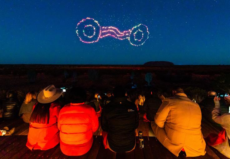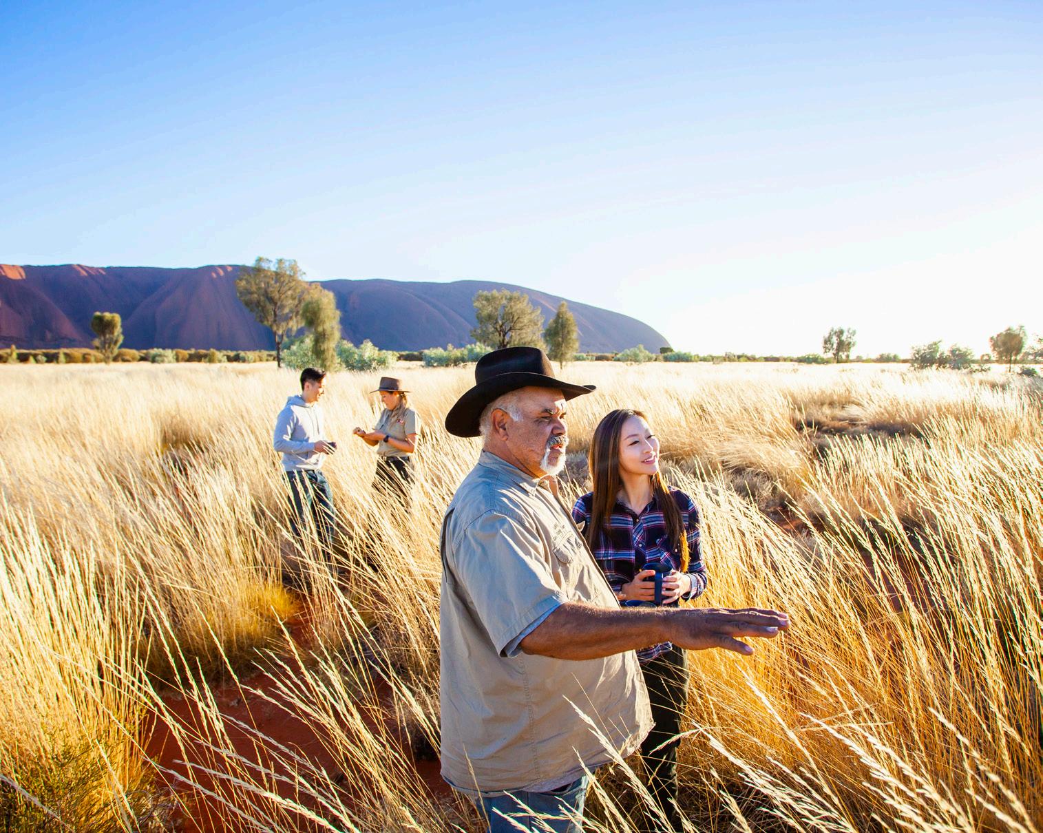 around the base, your guide will take you to the entrance of Mutitjulu Waterhole, a semi-permanent watercourse nestled in the contours of Uluru. Here you will learn the Creation stories of Liru (venomous snake) and Kuniya (woman python) as well as a number of other stories associated with other prominent Tjukurpa (Creation) stories. You will see the rock art of the Anangu people and learn how Uluru was, and still is, a significant location for teaching young Aboriginal people. We then adjourn to the new Talinguru Nyakunytjaku viewing area where you will observe an uninterrupted view of Uluru with Kata Tjuta in the background as the sun sets. Revel in the peace of the desert as you enjoy a chilled sparkling wine. Your guide will then return you to your accommodation at Ayers Rock Resort