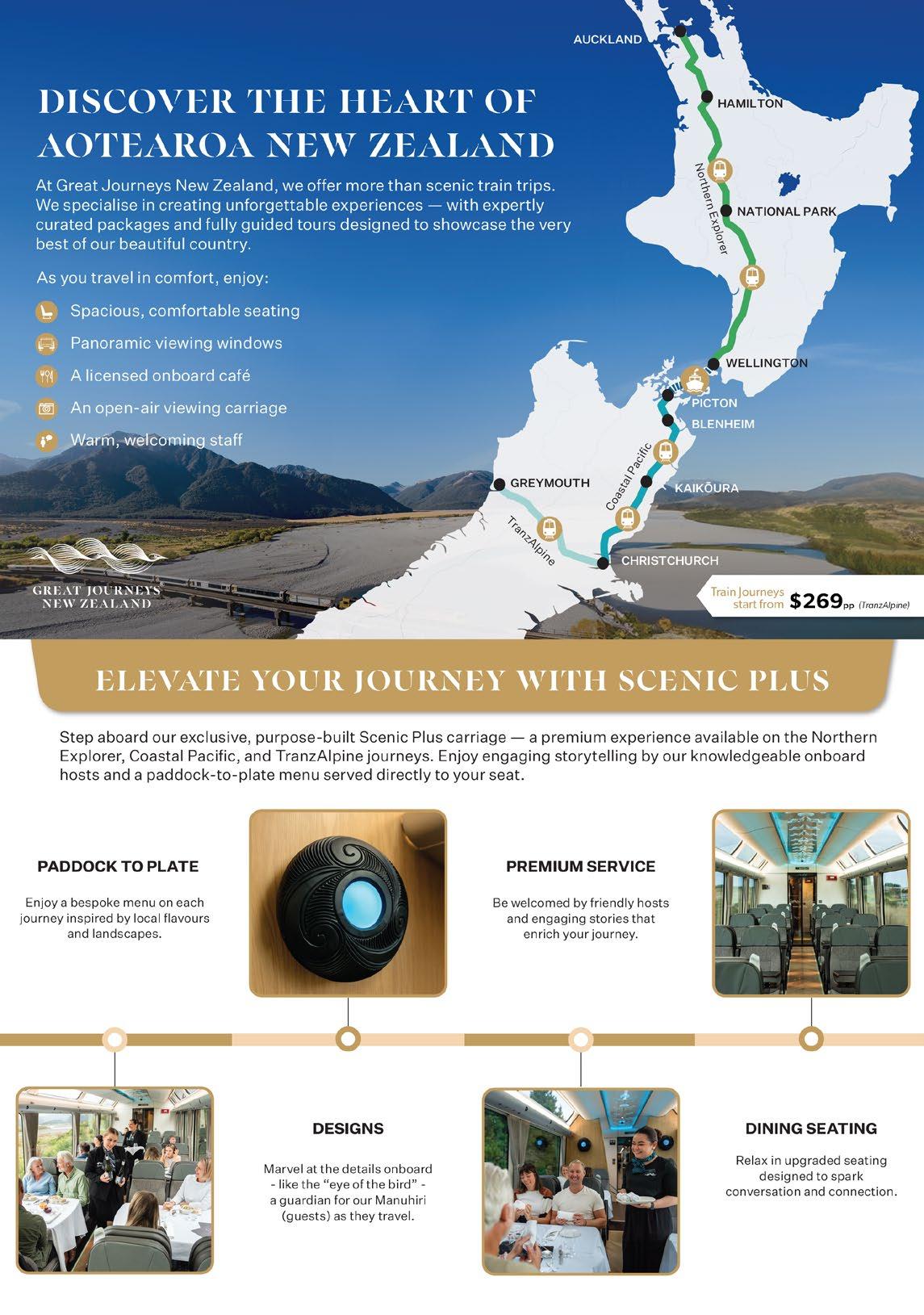 Climb aboard one of New Zealand’s Great Rail Journeys. Discover three spectacular rail journeys, each showcasing a unique view of New Zealand’s famous scenery. From sleeping volcanoes to cascading waterfalls, sparkling cities and rural farmsteads, golden beaches and snow-capped mountains, you will enjoy an immersive experience and a deeper connection with Aotearoa New Zealand.