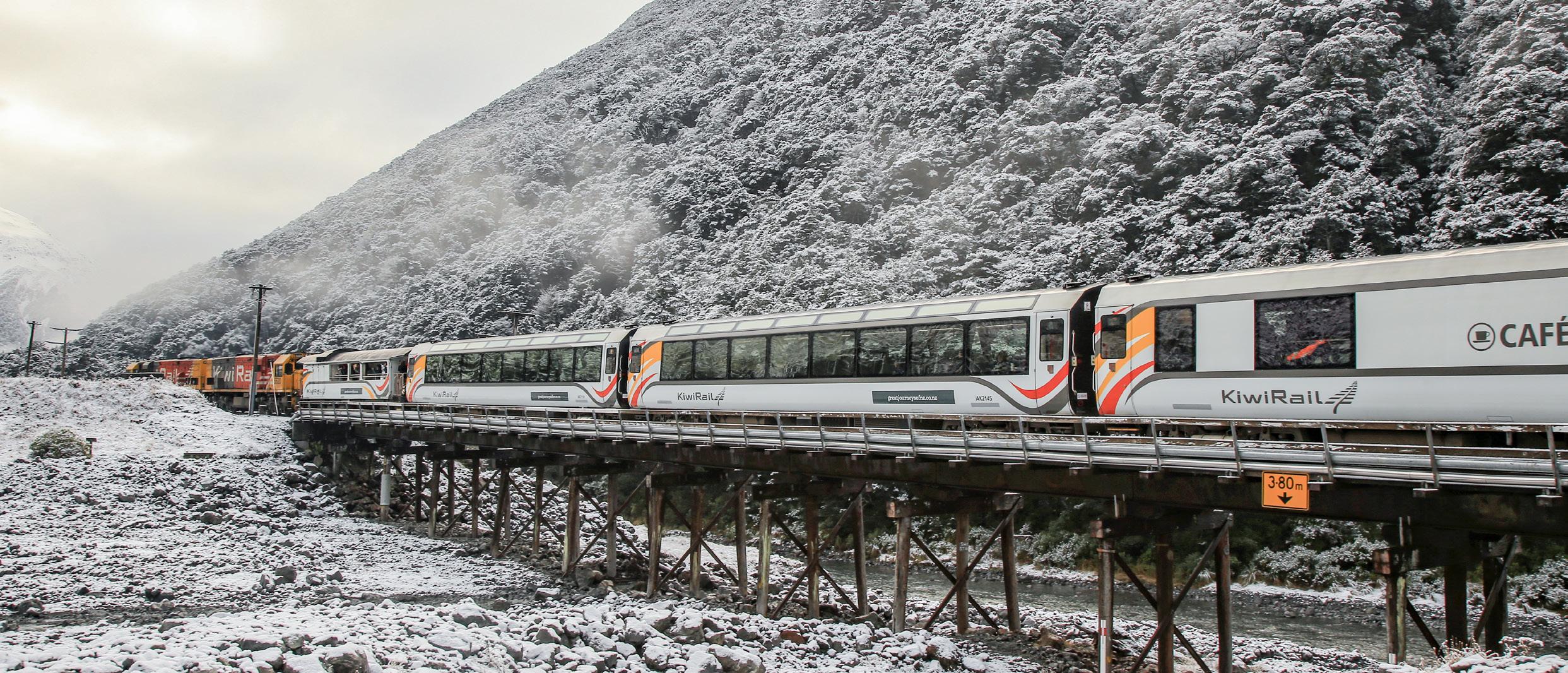 TranzAlpine: Hop aboard the TranzAlpine Rail Journey and be treated to exceptional views of snow dusted mountain ranges.