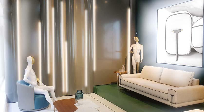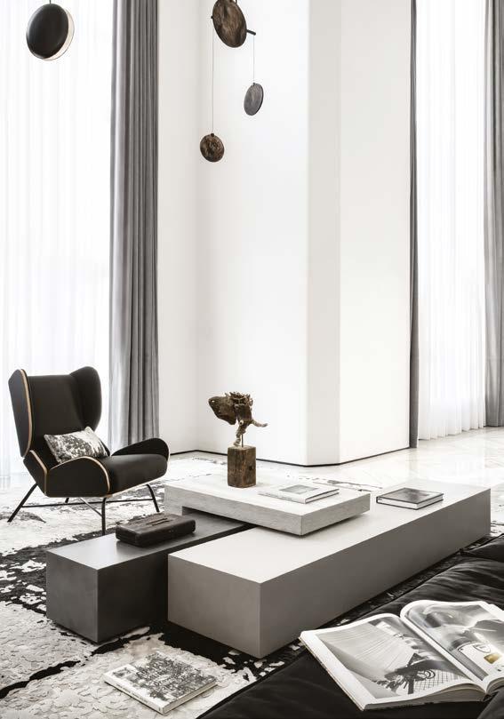 Showroom di Turri a Carugo di Giuseppe Viganò & Studio Viganò. A sinistra, in senso orario: parallelepipedi girevoli con gole luminose; parete con inserti di verde; incasso luminoso a soffitto; divisorio in vetro con verde interno; pavimento in resina. A destra: tagli di luce a soffitto che proseguono sulla parete di fondo; box luminoso. Turri’s showroom in Carugo by Giuseppe Viganò & Studio Viganò. Left, clockwise: revolving parallelepipeds with light grooves; wall with green inserts; ceiling light recessed; glass partition with green inside; resin floor. Right: ceiling light cuts continuing on the back wall; light box. UN VIAGGIO ALLA SCOPERTA DEI DIVERSI STILI DEL VIVERE CONTEMPORANEO, ATTRAVERSO LO SGUARDO DELL’ INTERIOR DESIGNER GIUSEPPE VIGANÒ A JOURNEY EXPLORING THE DIFFERENT STYLES OF CONTEMPORARY LIVING CONTEMPORARY LIVING, THROUGH THE EYES OF INTERIOR DESIGNER GIUSEPPE VIGANÒ Texts and drawings by Giuseppe Viganò and Studio Viganòvolumi vuoti e pieni di chiaroscu ro. A volte vengono inglobate nell’architettura in modo da non essere volutamente viste, altre volte vengono esaltate in modi cosi particolari da non lasciare indifferente lo spettatore. Le luci accendono emozioni. Proprio per questi motivi la luce non può essere messa in secondo piano durante la progettazione architettonica, ma deve andare di pari passo con la progettazione dell’arredo e tutto ciò che lo cir conda. Deve essere parte integran te della fase progettuale in modo da valorizzare lo spazio e creare differenti suggestioni emotive. Per l’allestimento fieristico, il negozio a Milano e lo showroom