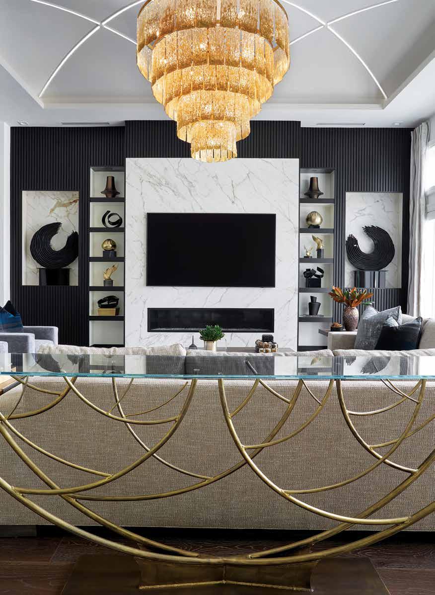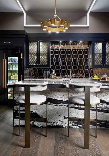 Kitchen: Showcasing a bold contrast between dark and light elements, the kitchen features sleek white cabinetry accented with black tabour details that resonate throughout the home. This culinary paradise is a dream for chefs, equipped with a mix of paneled and exposed appliances sourced from Ferguson Bath, Kitchen & Lighting Gallery. A unique ceiling adorned with channel lighting beautifully frames exquisite champagnecolored beaded wallpaper, enhancing the overall ambiance. The Cristallo backsplash and countertops from UMI Stone light up, adding an ethereal glow, while the working countertop areas are a durable quartz. “That’s the essence of the entire project. Everything is functional and practical, yet the space is beautiful, with sophisticated elements that are perhaps a bit extravagant,” notes Guild. Adjacent to the range, a concealed door opens to a spacious service pantry, ensuring convenience without compromising aesthetics. Every detail has been meticulously considered, from the reflective range hood to the elegant brass toe kicks, creating a cohesive and inviting atmosphere.