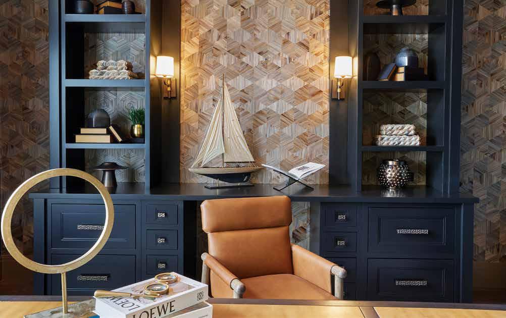 Office: The husband’s home office showcases a unique combination of wood tones, accentuated by elegant wooden wallpaper from Phillip Jeffries. A striking wagon-wheel ceiling treatment featuring a copper inset adds character, while a captivating rattan light fixture from Currey & Company draws the eye. The sleek leather sofa provides a modern contrast to the plush velvet chair, and the deep blue-green wall color serves as an ideal backdrop for the homeowner’s trophy fish, creating a harmonious and inviting atmosphere.