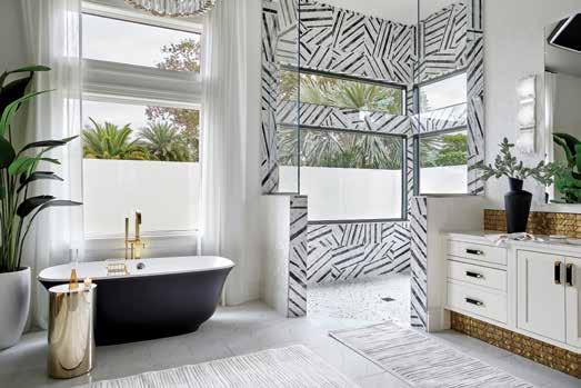 Primary Bedroom: The designers implemented several innovative approaches to create a primary suite that captures the essence of a luxury hotel. Custom storage solutions tailored to the homeowners’ unique needs were crafted by Inspired Closets. LMG Design Consulting developed a bespoke wallpaper by Fenwick Bartel, incorporating design elements from various parts of the home. “We used an image of the porcelain slabs found in other areas of the home when designing the custom wallpaper,” explains O’Brien. The geometric lines of the wallpaper are echoed in the Schumacher fabric draperies. To soften the modern aesthetic, the designers introduced curvilinear shapes through chair and ottoman sets, as well as an upholstered bench at the foot of the bed. Two large pillshaped mirrors reflect light from John-Richard pendants from Corbett Lighting, adding a touch of elegance and functionality to the space.
