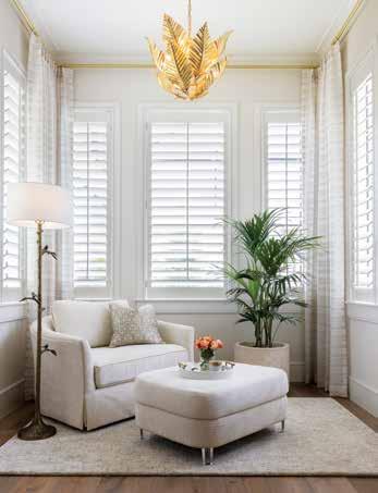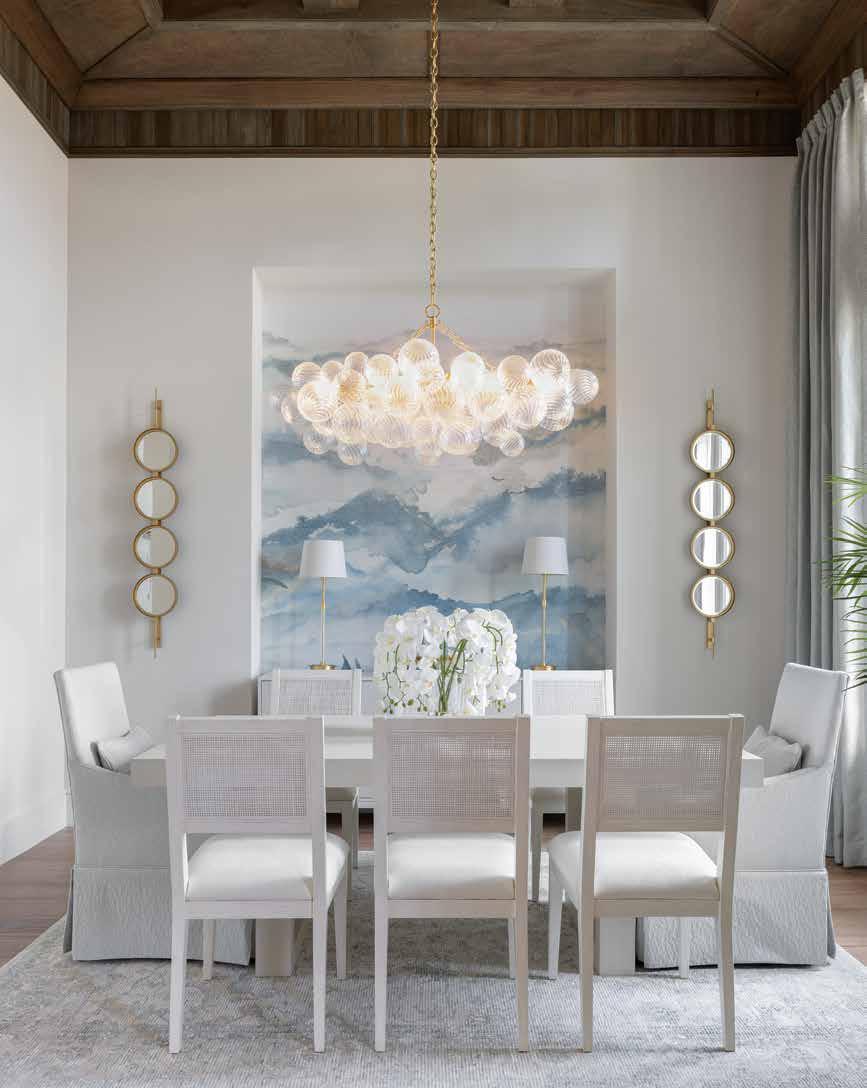 This harmonious blend carries over to the living room, where Nolan ensures the design tells a story through its focal point. “A house of this size needs a feature wall,” Nolan reflects, highlighting the custom built-in with a fireplace framed in motherof-pearl tiles — an earthy material with a luminous shimmer that beautifully symbolizes the union of organic and glamorous styles. Fresh-cut fronds, white coral, and branches on the console table evoke nature’s strength and beauty. At the same time, a delicate fretwork vase and majestic blue-seeded glass lamps bring a refined, sparkling femininity, creating a living room that feels both grounded and glitzy. u