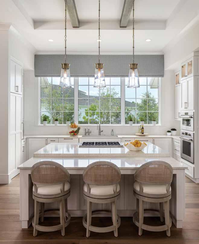 Kitchen: Nolan’s white-glove approach ensures every detail is considered, down to fresh lemons in a Capiz shell bowl. The white shakerstyle cabinetry establishes a crisp, coastal foundation for the kitchen, complemented by the collage of blue abstract art. Counter stools from Modern History introduce natural cane textures, while gold pendants by Visual Comfort and pearlized vinyl on the nook chairs by Fairfield Chair bring subtle glamour and practical durability.