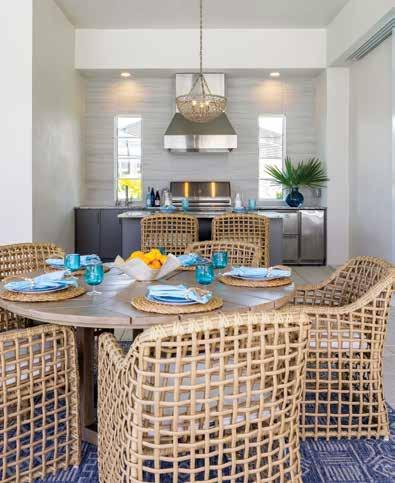 Outdoor Living: To enhance coastal sophistication, Nolan selects dining chairs and counter stools from Azzurro Living, featuring a bold woven design that adds a striking framework and a coastal aesthetic. The weatherized teak dining table from Tommy Bahama is styled with bamboo leaf placemats, turquoise and sky-blue accents, and a Capiz shell bowl that adds glamour. Above the outdoor island, a woven chandelier from Palecek creates warmth, while a nautical blue area rug from Surya anchors the space with a coastal-inspired foundation.