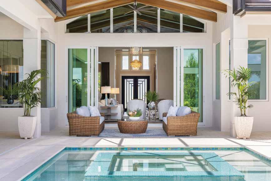 Lanai: From this vantage point, the Kalani chandelier by Varaluz emerges magnificently, its exquisite composition of French gold, crystal, and shell radiantly illuminating the foyer’s elegant space. “This chandelier was my starting point for the design and the inspiration for melding glamorous bling with organic elements,” Nolan shares. Poolside, the furniture arrangement creates an inviting lounge area, blending tropical-inspired sofas from Southern Home Outdoor Furniture with a resin coffee table by Summer Classics, offering a relaxed yet refined setting.