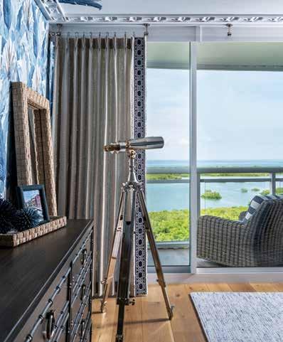 Guest Bedroom: Saturated color, intricate pattern, and tropical textures intertwine to create expressive yet approachable, whimsical yet warm design, where cockatoos, hummingbirds, and birdcage pendants serve as playful focal points that anchor the concept. Yet, when subtly is desired, a fascia from Shade & Shutter Concepts conceals the mechanism of the room-darkening shade, allowing the blue fringe and motherof-pearl trim on the drapery to capture attention. Campaign-style pieces, like the Theodore Alexander nightstand and Century bed, lend a “globe-trotting” sensibility.