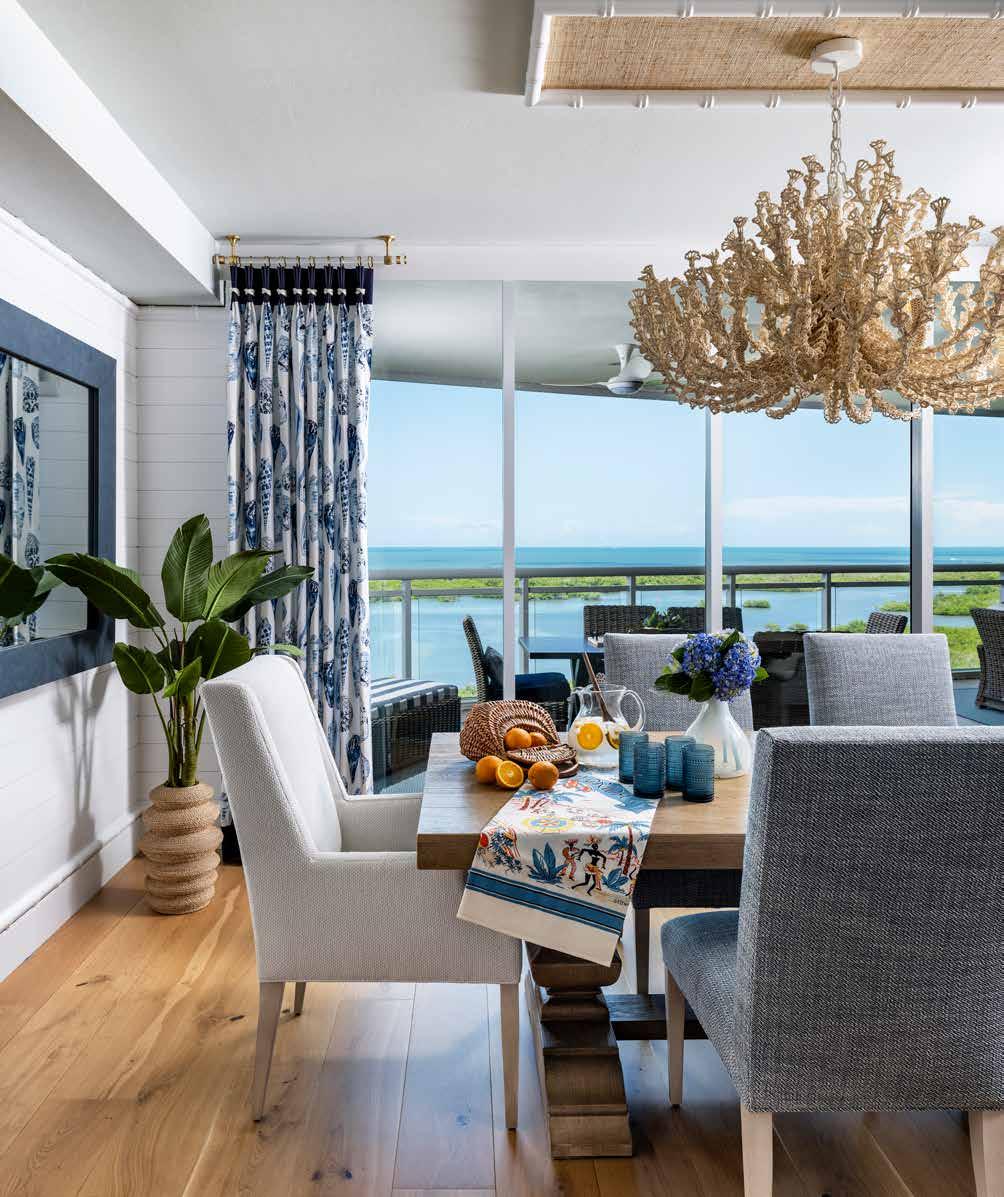 Dining Room: Nickel gap cladding, detailed with bamboo-style trim, creates a recurring architectural rhythm that Davis carries throughout the home. Extending from the primary vestibule across the window wall, the treatment anchors the dining space while shaping moments of intentional calm within a lively palette. A blue-framed mirror reflects the inspired drapery, while a rustic table, and a Palecek chandelier — beaded with delicate coco beads — anchor the room with a warm coastal charm.