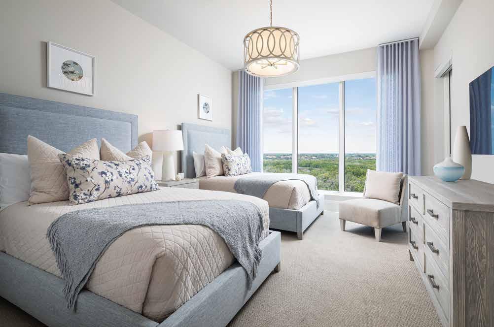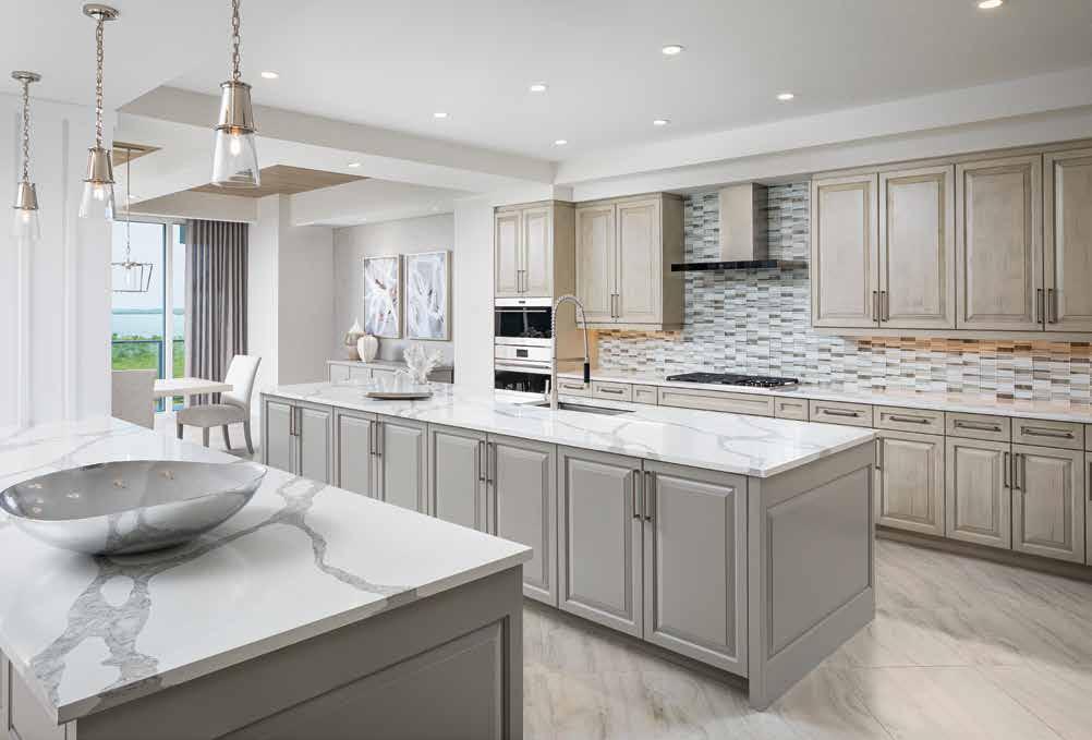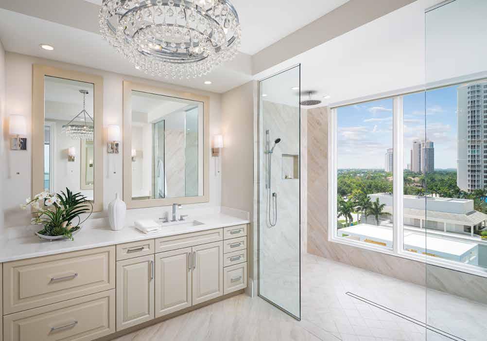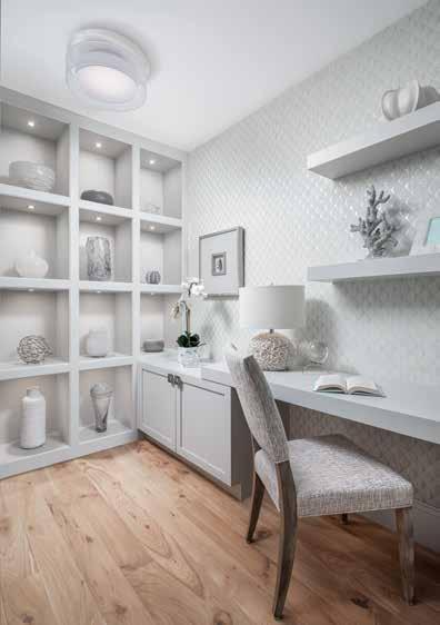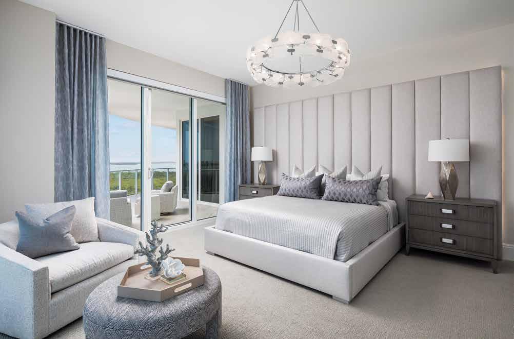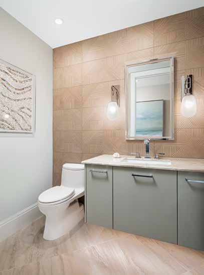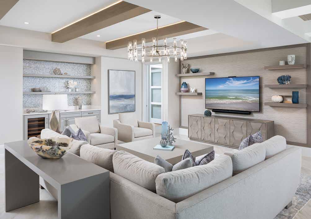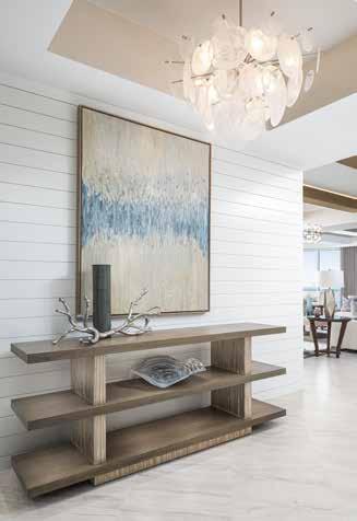 The renovation is unmistakably transitional, blending soft hues and organic forms with a neutral palette to evoke a serene, spa-like atmosphere. As you step off the elevator and enter the space, the beachy sense of calm is evident, highlighted by Walter’s thoughtful redesign of the foyer’s ceiling tray, which foreshadows the elaborate transformations in the great room and gallery. “The ceilings were a blank canvas,” Walter notes. Despite their polished appearance, the new ceiling designs are the product of meticulous planning, careful alignment of all elements, and master construction — resulting in a cohesive aesthetic. u