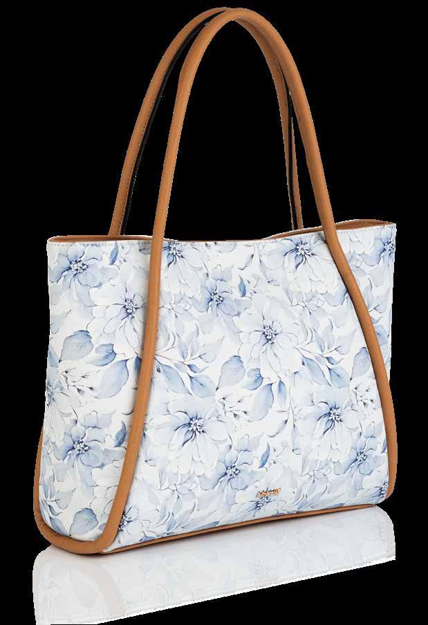 White textured PU tote handbag. Blue printed floral motif. Caramel PU trim. Gold plated hardware. Nylon zip closure. Branded full lining. Inner side pockets. Protective dust cover.