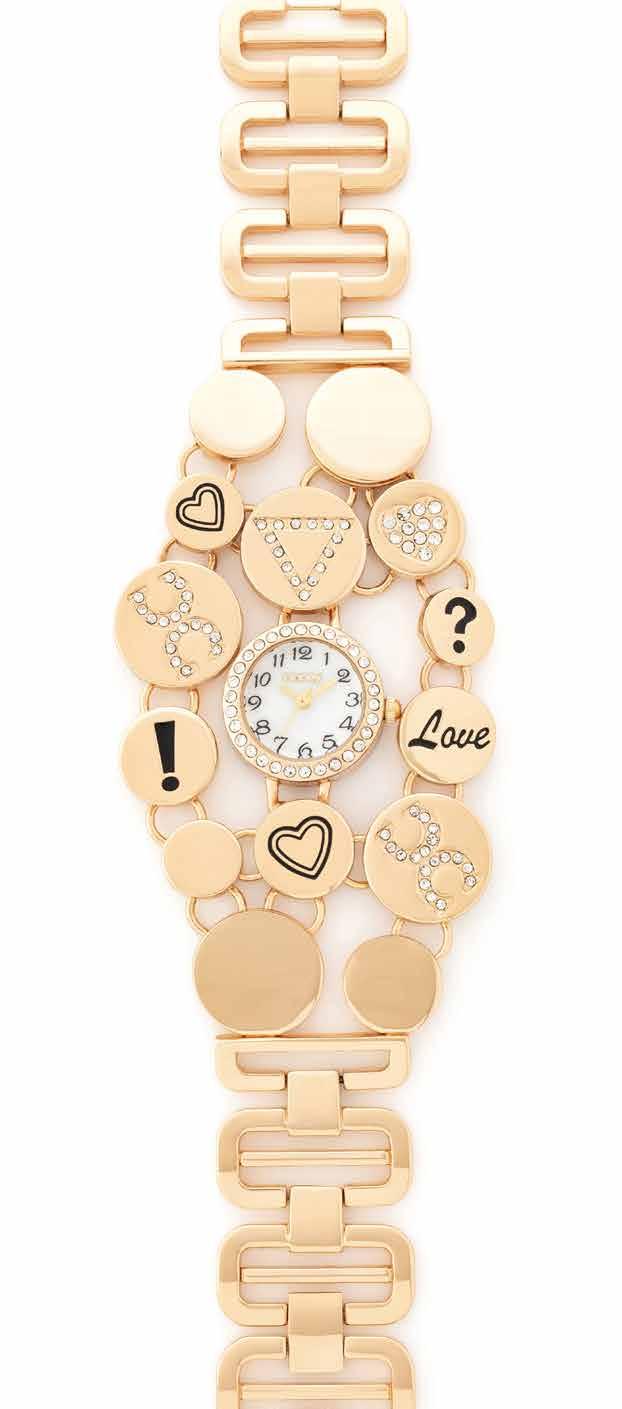 Gold plated bracelet style analogue watch. Gold plated hands. Black dial. Matching bezel. Black silicon strap.