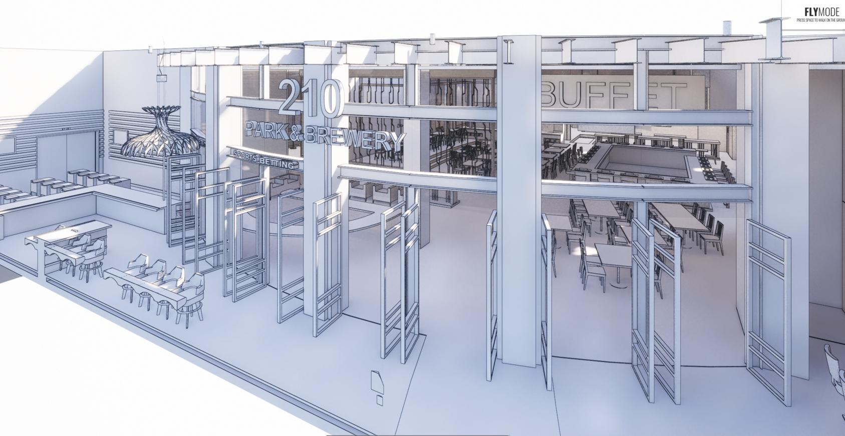My Responsibility: I modeled and adjusted the main entrance per the design concept from another team and organized the space and wall types within the sports book area.