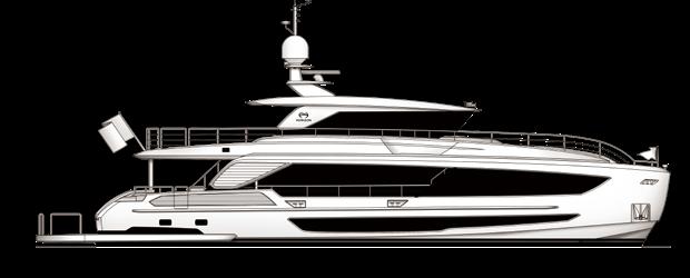 Available in a Skyline or Tri-Deck version, the FD100 offers five staterooms, including a full-beam master suite on the main deck. The Tri-Deck layout option offers a lightweight open flybridge equipped with a helm and seating area atop the bridge deck, which features a forward wheelhouse, interior skylounge with dayhead and bar and jacuzzi aft. The Skyline configuration offers a large wheelhouse with enclosed skylounge aft along with ample deck space for entertaining. The FD100 is designed with spacious crew quarters for four aft as well as a fully equipped beach club.