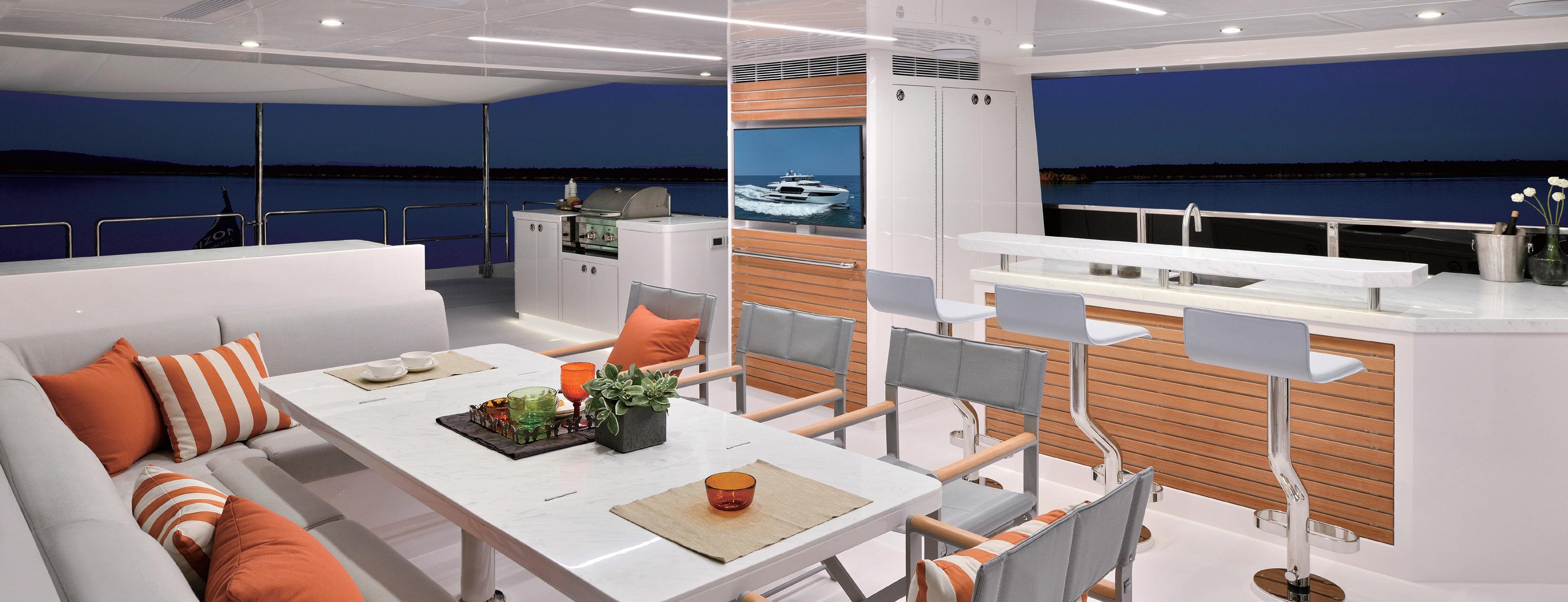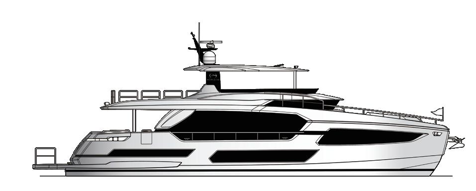 From the foredeck to the bridge deck, to the upper tri-deck, the exterior areas are designed to suit the owner's preferences.