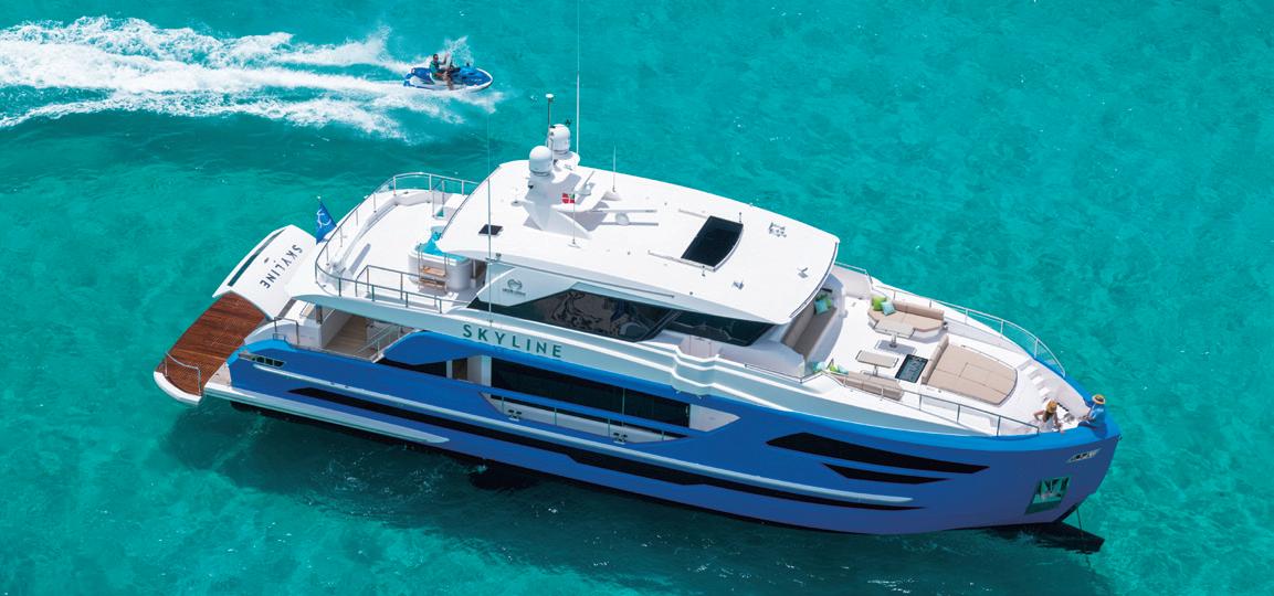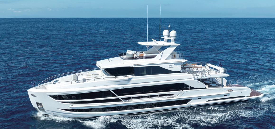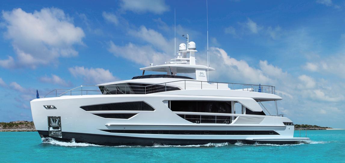 Offered in a Tri-Deck or Skyline configuration, the FD110 comfortably accommodates a crew of six in forward crew quarters with a large, fully equipped beach club aft. This five-stateroom yacht features an On-Deck deluxe master stateroom and plentiful dining and entertaining areas throughout.