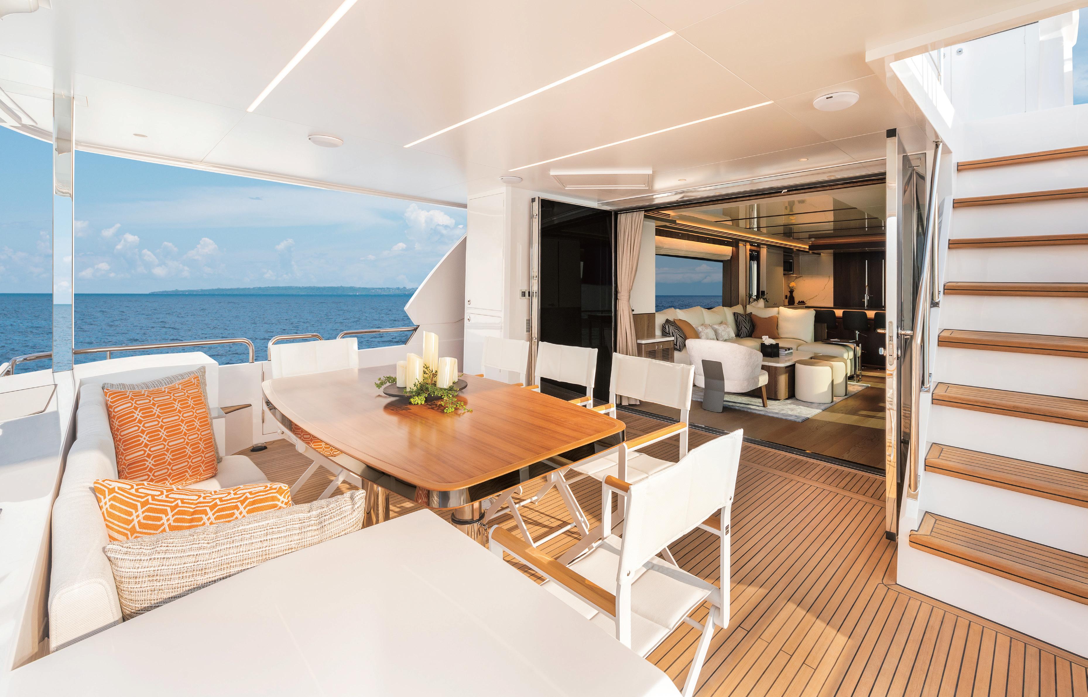 Offering multiple configurations, such as a fully enclosed or split-use skylounge, the FD80 boasts functional outdoor spaces that rival those found on 90 ft-plus motoryachts.