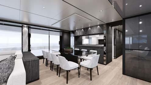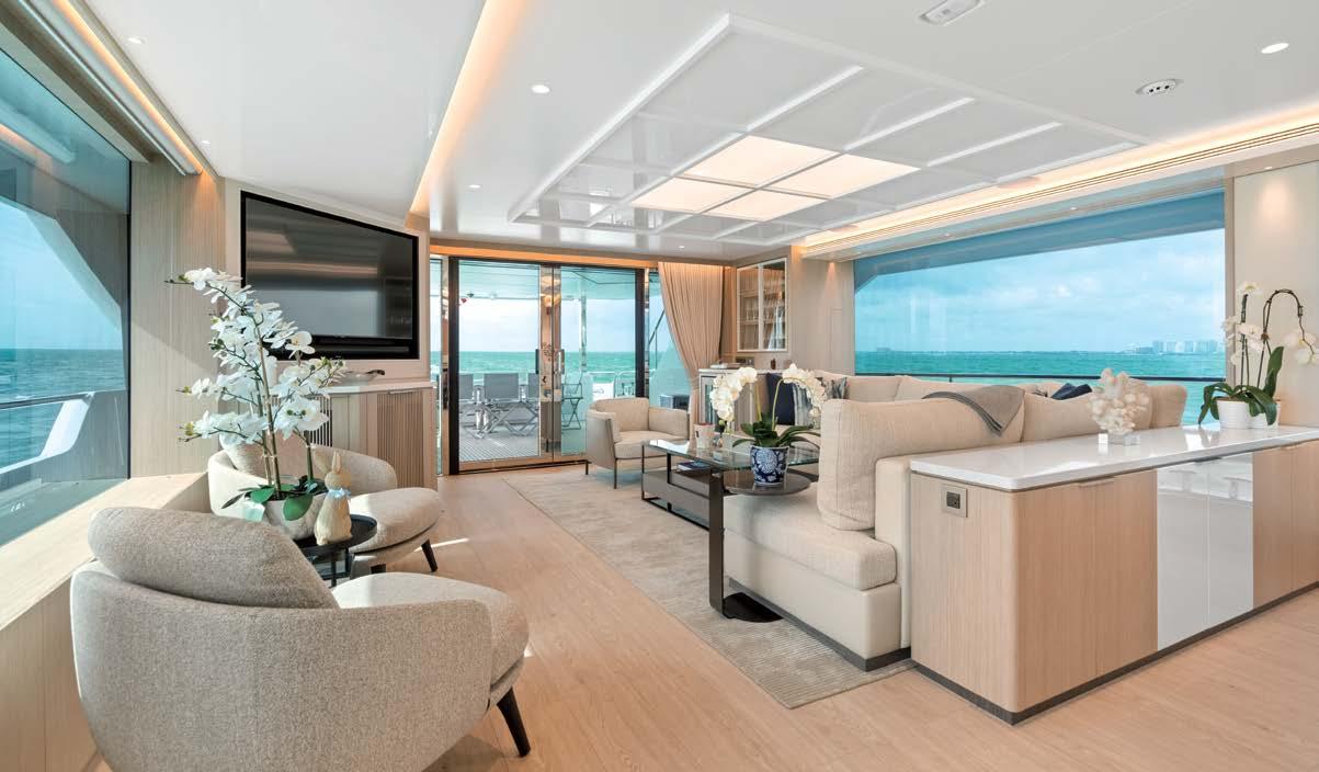 Luxurious comfort extends to the boat deck just below, where the split-use skylounge maximizes the usable interior space. A clever design element is the use of wood-decorated horizontal-grain panels for the lifting screen and a hidden door between the skylounge and wheelhouse, which provides enhanced privacy without compromising the flow of the interior styling.