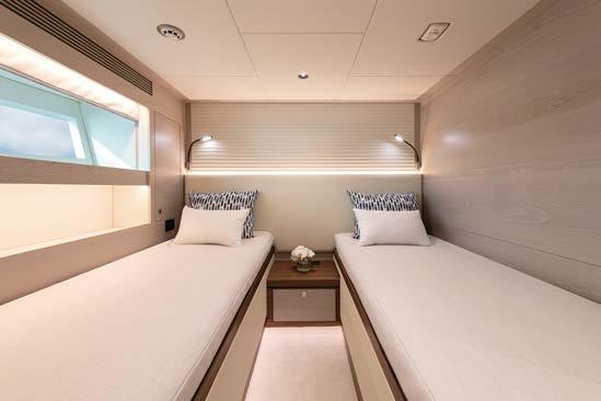 Transitioning to the lower deck, the entire staircase art wall features textured woven leather, beautifully illuminated by strip lights. In the guest foyer, storage space and a large washing machine and dryer specified by the owner are installed. A familiar home-away-from-home vibe weaves throughout the four ensuite staterooms, comprising mirrored VIPs amidships, a twin cabin to port, and a versatile forward VIP. Each is designed with specific storage needs in mind and features glossy white ceilings that accentuate a sense of volume.