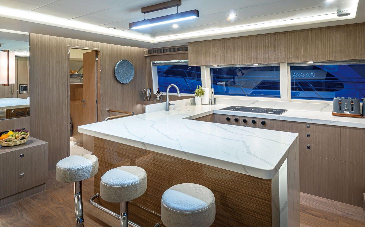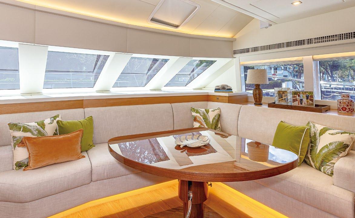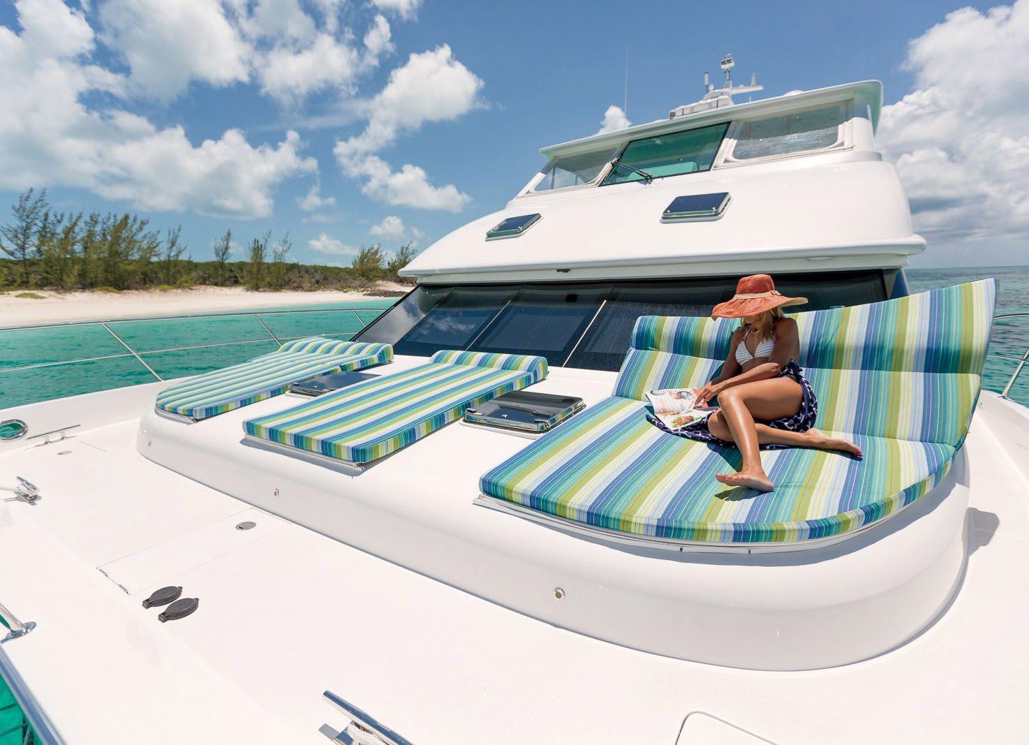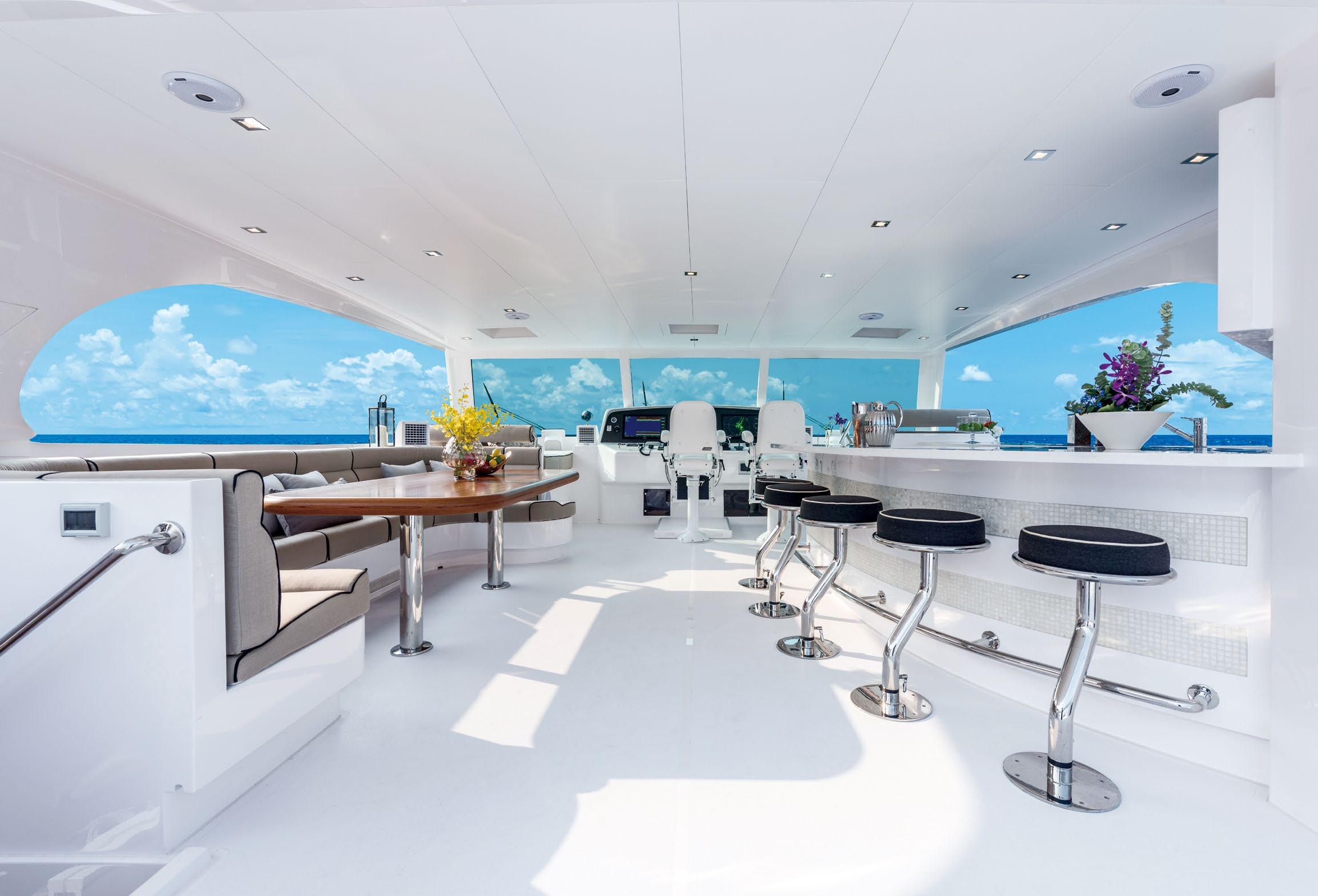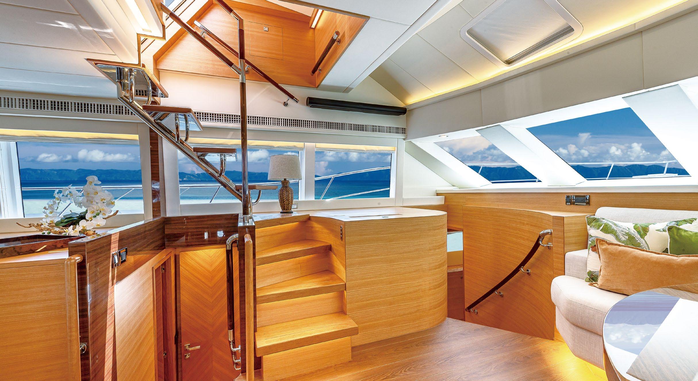 Exterior entertaining and lounging areas are plentiful on this custom PC74, from the multifunctional, air-conditioned open flybridge equipped with a full-service bar, BBQ, day head with shower, and dining and lounging areas, to the wonderfully spacious forward deck fitted with twin sunpads.