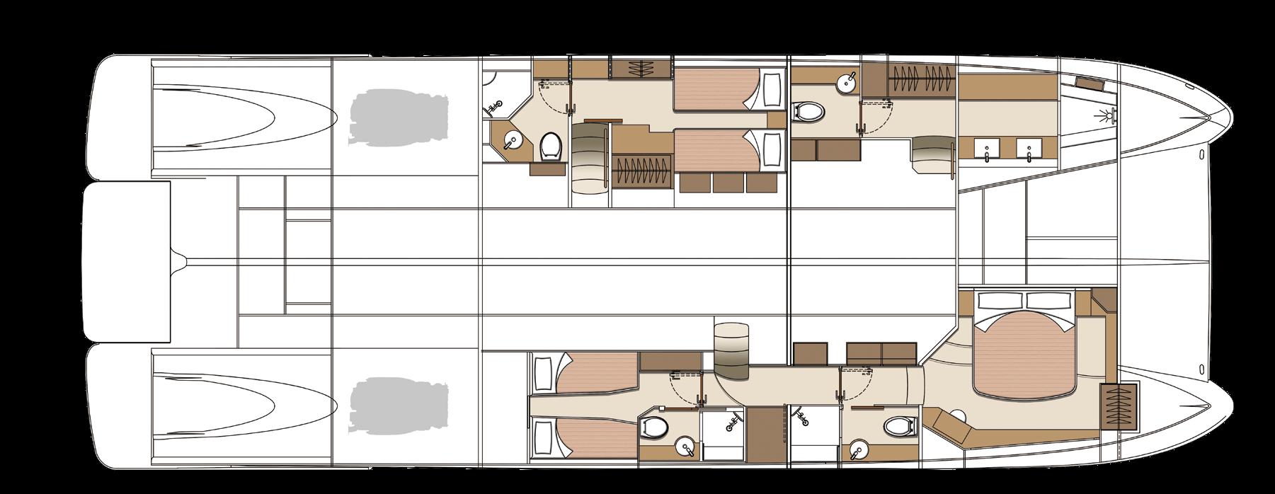 The ultimate luxury power catamaran, the PC60 stands out among other multihulled yachts for her effortless blend of elegance, stability and efficiency. From the on-deck master stateroom option to the air-conditioned flybridge and expansive aft deck, the PC60 is a example of high caliber workmanship and equipment with a myriad of luxury features packed into its 24' 6" beam. Available in On-Deck Master or Open Salon layouts.