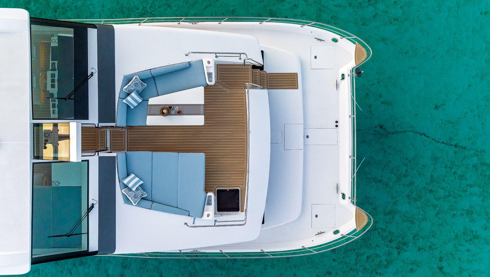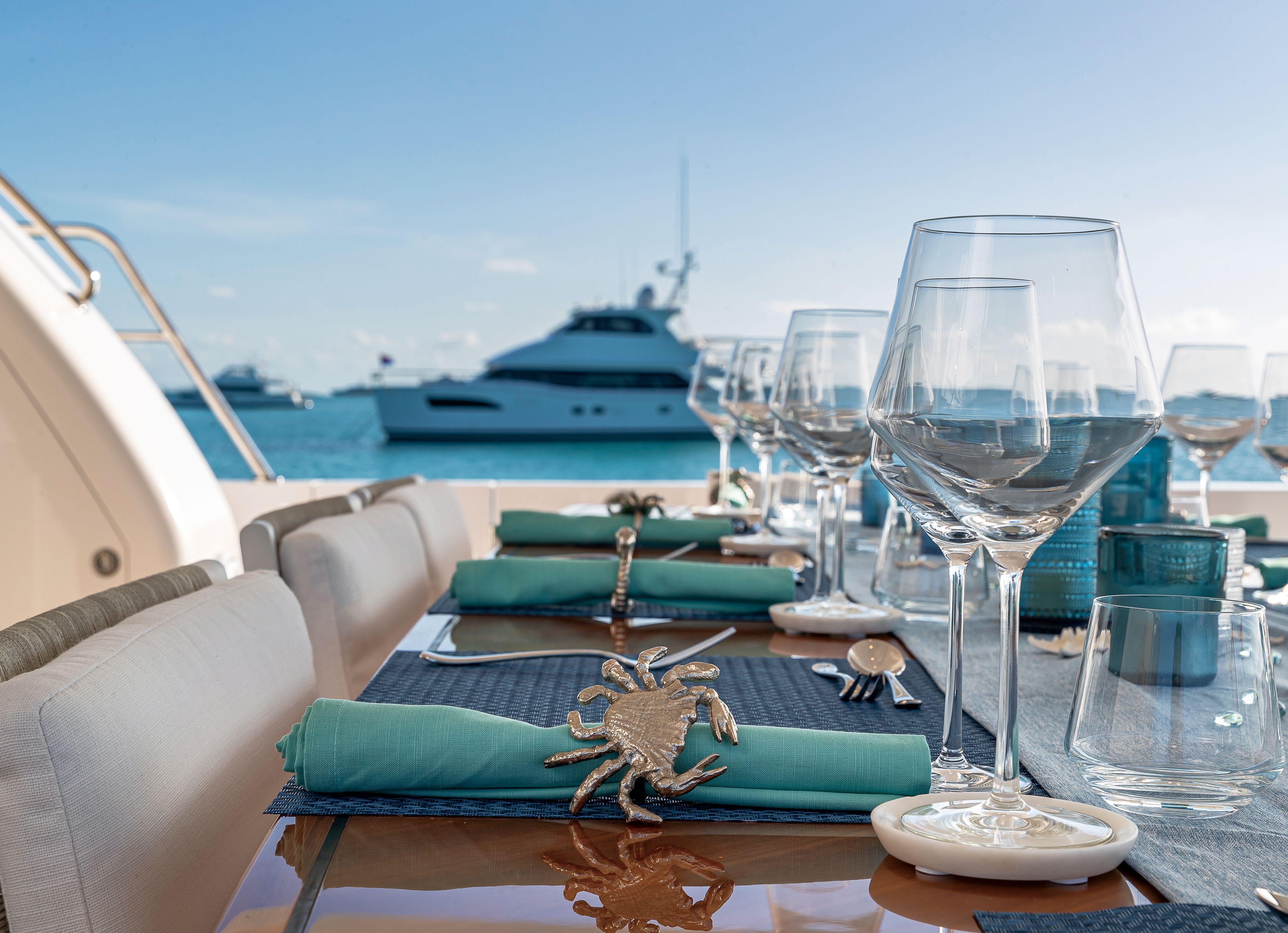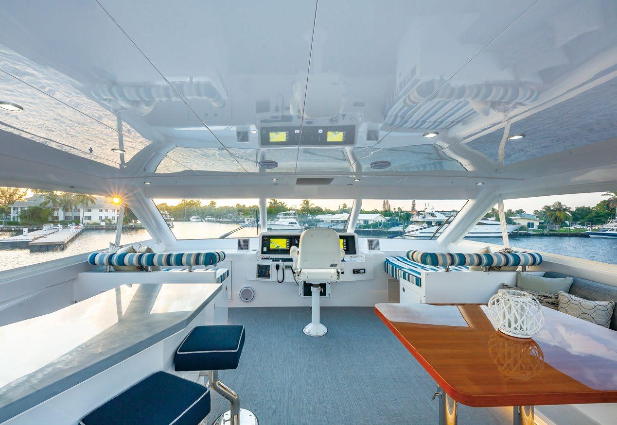 The custom PC74's 28'3" beam makes for an impressive aft deck, which offers dining for ten, a large comfortable sofa with two side cabinets, and a wet bar with fridge, icemaker, and television.