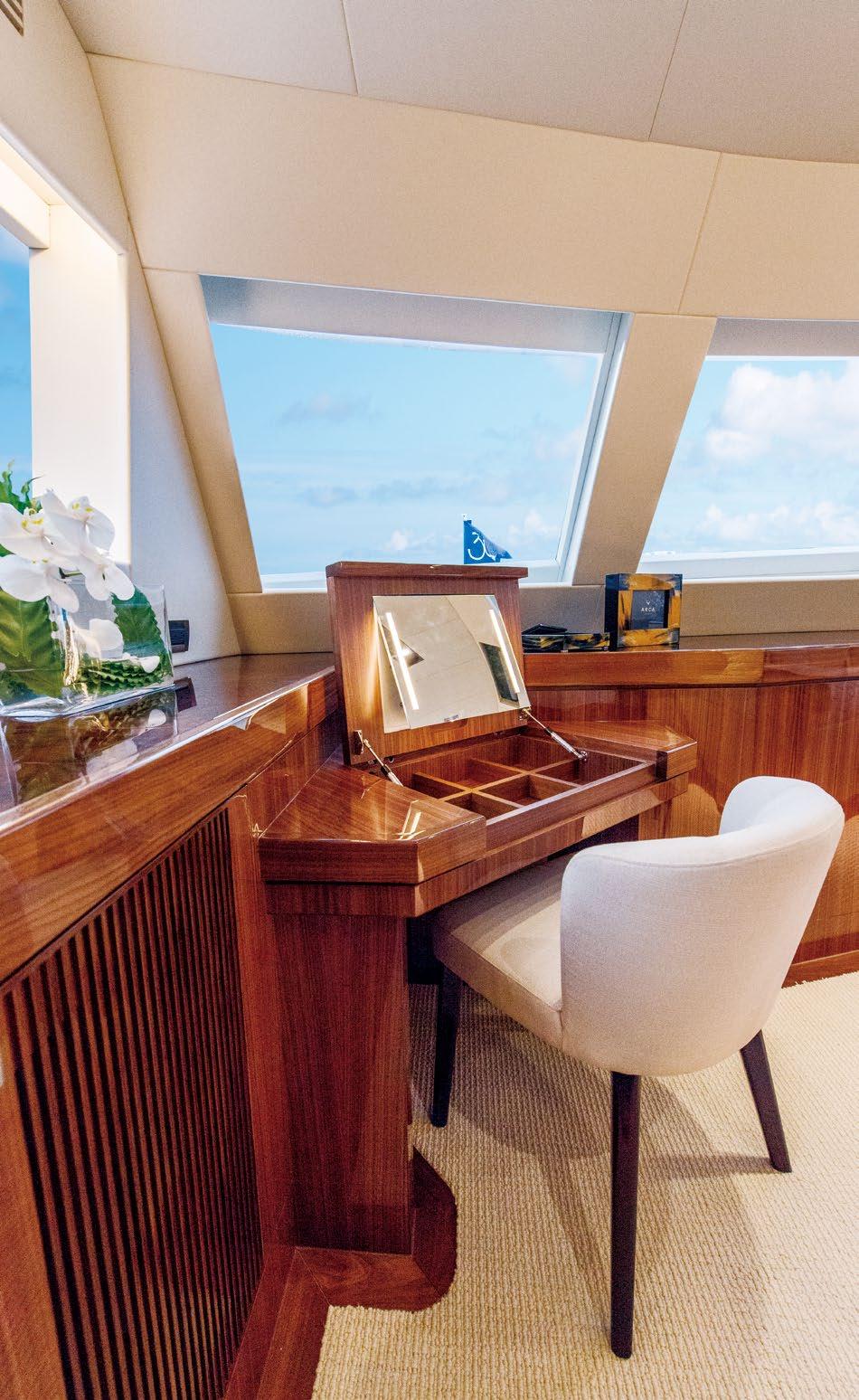 Large windows offer panoramic views and accentuate the headroom in the full-beam, on-deck master stateroom, a relaxing sanctuary offering a cozy reading area and a spacious ensuite.