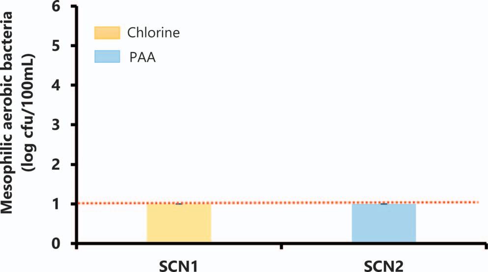 Impactofwashingtreatmentsonmicrobialloadof processwashwaterofcarrotintestedSCNs. Figure4 comparesthemesophilicaerobiccountsfoundinwashing watertreatedwithchlorineorPAAontheprocessingwash waterofcarrots.Mesophilicbacterialloadoftheprocess washingwaterwasexamined,anditwasrevealedthat similarlowcountswerereached(belowthethresholdof detectionof10CFU/mL)overa90-minprocessingperiod inthewashwaterofbothSCNsstudied.Nosignificant differences(P . 0.05)wereobservedinthemesophilic populationremaininginthewashtanksaftertreatmentwith chlorine(SCN1)andPAA(SCN2).