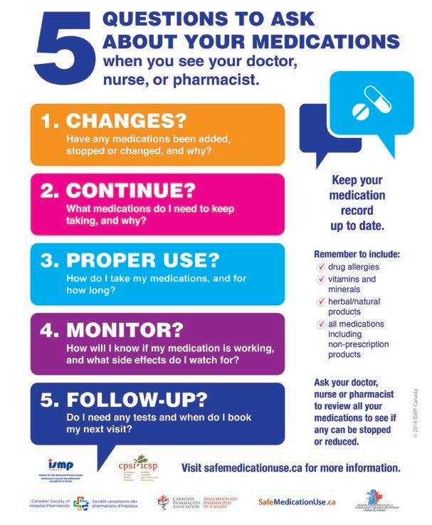 As the recipient of care, patients should always consider the five questions to ask about their medications (see Figure 1)) during a clinical encounter with their healthcare providers. Patients should always be well informed of their medications, including vitamins, supplements, and natural health products. They can discuss and ask their pharmacist or healthcare team about their vitamins, supplements, and natural health products. This can help their healthcare team identify potential interactions and manage them appropriately.