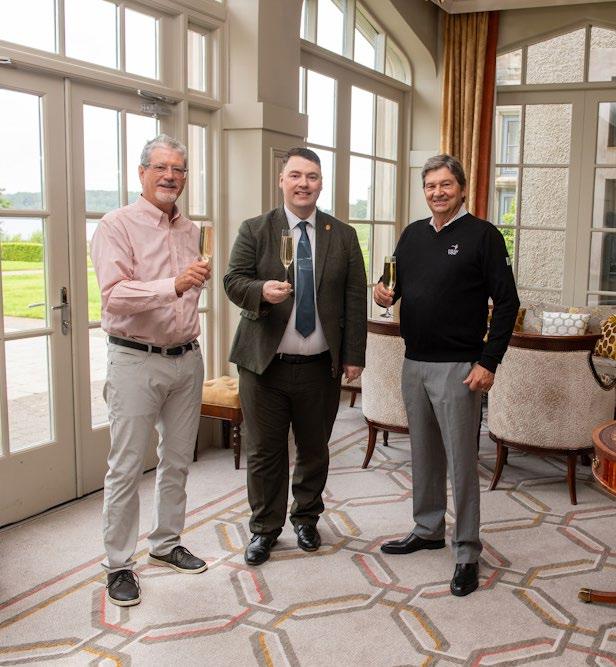 Lough Erne Resort General Manager Gareth Byrne (centre) celebrates the resort’s multi-millionpound revamp with Jeff Mahan (left) and Mark Ward (right), from operators TRU Hotels and Resorts LLC. For more information, visit lougherneresort.com