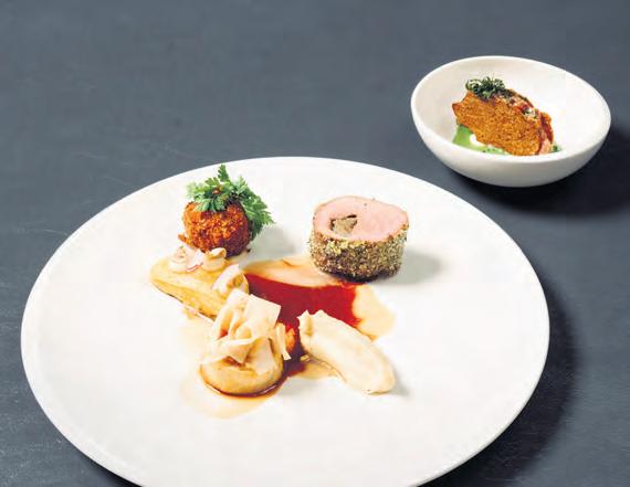 zeugte die Jury mit einem gebratenen Schweine-Wantan mit Champignons auf gedünstetem Lauch, einer gerösteten Gemüse-Pilz-Sauce und weissen A lgen als Amuse-Bouche. Der Hauptgang bestand aus sous-vide gegartem Filet vom Schweizer Schwein im Mangoldmantel mit Liebstöckel-Hollandaise-Espuma sowie geschmortem S chweinsbäckli mit konzentriertem Jus. Dazu servierte er Laugenknödel mit karamellisiertem Zwiebelpüree und eingelegten Bärlauchkapern. Ein