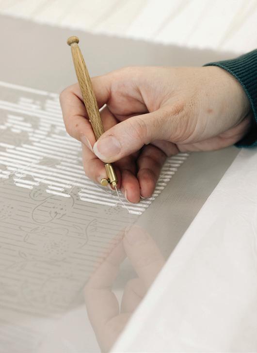 Anne-Marie Ramos sits by a floorto-ceiling window with a bright strip light over her large wooden embroidery frame, on which a strip of the black organza is stretched. She’s bending over a rectangular panel about 30cm by 15cm that will take her 40 hours to entirely cover with sequins in exactly the right colours and textures. No one else could do it any quicker – Ramos has been working at Lesage for 38 years. Using a minute Lunéville crochet hook, she catches the thread, then takes a sequin and attaches it. Over and over again. What’s more, she’s working blind – the sequins are underneath, so she sees the finished result only when she turns it over. “It’s lots of touching, you work with your hands,” she explains. With some designs, she has to crush each individual sequin with a hammer, or fold it with pincers. It’s painstaking, intense work. “But I never get sick of it,’” she says. “You’re always learning.” If there’s a rush on, two women will work on the same small square of cloth to get it finished for a catwalk show, or bride in a hurry. On occasion, six embroiderers will be bent over the same strip; and, says Ramos, there have been times when, crammed round a frame, “I’ve sat on a