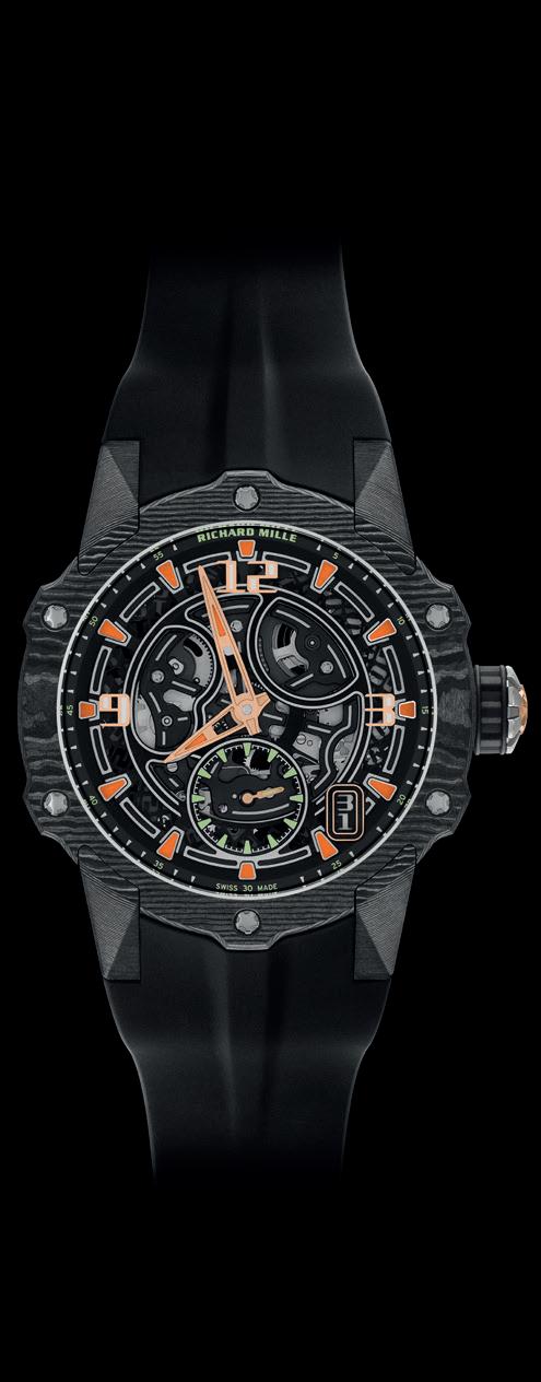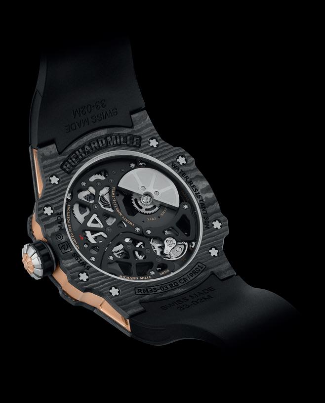 3.28mm) made possible by the off-centre positioning of its solid platinum monobloc micro rotor. “The idea is to accentuate the volumes within the calibre,” says Cécile Guenat, Creation and Development Director at Richard Mille. It’s issued in two equally striking iterations – one in full grade 5 titanium, the other in the brand’s signature Carbon TPT® with 5N red gold, each with a small-seconds display at 6 o’clock and both measuring just 9.7mm thick – and further reflects Richard Mille’s commitment to the exceptional, whether that be through the marriage of cuttingedge and high-end materials, precision engineering, or daring design. “As with every creation in the Richard Mille collection, the blend of elegance, technicity, and ergonomics exhibited by the RM 33-03 attests to the care that went into it,” adds Cécile.