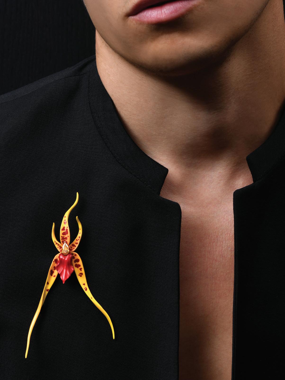 pieces. Their latest offerings evoke designs prevalent during the roaring twenties and include the Art Deco-inspired Fleur, its petals fashioned from carnelian cabochons, its centre a sparkling mosaic of 46 diamonds, and its case crafted from 18-carat rose gold.
