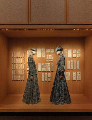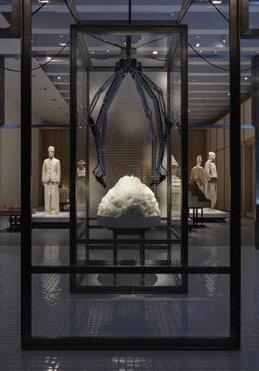 The exhibition’s final segment, Restaging Valsesia, takes us back to Loro Piana’s homeland to reveal the behind-the-scenes processes in its distinctive savoir-faire. Here, a mannequin wears a billowing ensemble in silk satin, which features a delicate Lunéville embroidery that required 1,850 hours to complete.