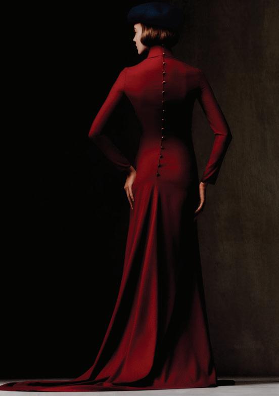 This page, clockwise from left: Gently draped floor grazing dress with bejewelled buttons in iconic Kummel red, crafted from exceptionally fine The Gift of Kings® wool in a diagonal weave and treated with the trademarked RainSystem® to make it waterrepellent; Images from If You Know, You Know. Loro Piana’s Quest for Excellence exhibition