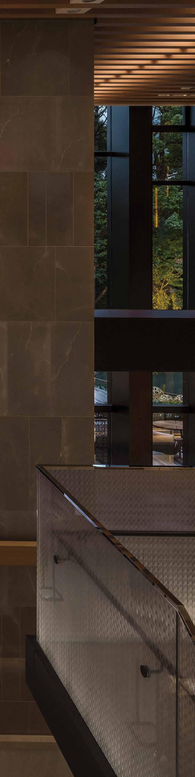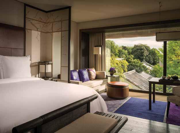 The tea house was designed by Kyoto architect Ryosuke Yamamoto, and Japanese artistry is a feature of the hotel both outside and in. Comprised of different forms and styles, artworks are abundant and begin at the hotel’s entrance, where the roof is crafted from cypress and cedarwood and shaped from multiple umbrella-like structures. Elsewhere, Seven Stones, by Tokyo-born sculptor Todo, sees shards of glass embedded in rocks handpicked from the pond garden to reflect Kyoto’s tradition and innovation, while the critically-acclaimed pottery works of three generations of Kyoto’s Kondo family (one of whom was once declared a Living National Treasure) decorate shelving.