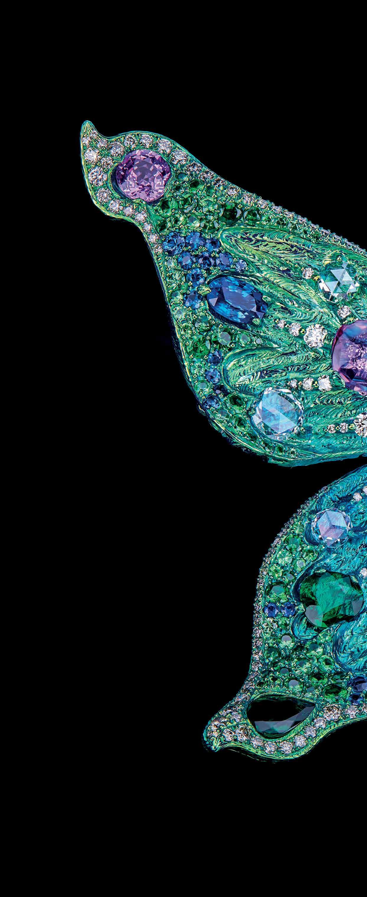 The exceptional creations of Wallace Chan, one of the world’s greatest living jewellery artists, have an appropriate stage to shine this month when they go on show at Christie’s headquarters in London. The largest ever European exhibition of Chan’s work, highlights include the Legend of the Colour Black , a unique shoulder brooch sculpture that contains a 312.24ct cut black diamond as its centrepiece, known to be the world’s largest. The intricate piece also features Wallace Chan Porcelain, a material Chan has spent years developing that’s five times stronger than steel. Another notable brooch, The Joy of Life , features Chan’s emblematic butterfly, composed of pink sapphire, sapphire, tsavorite garnet, diamond, yellow diamond, pearl, and titanium.